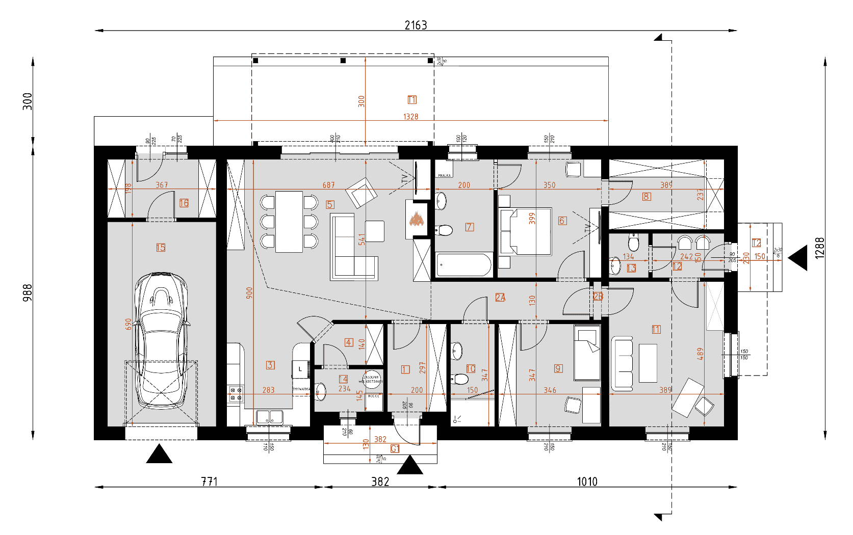 - rzuty wszystkich kondygnacji (np. parter, piwnica, piętro) – rozmieszczenie i wymiary wszystkich pomieszczeń, rozmieszczenie i wielkość otworów okiennych i drzwiowych, rozmieszczenie kominów, sugerowana aranżacja wnętrz.