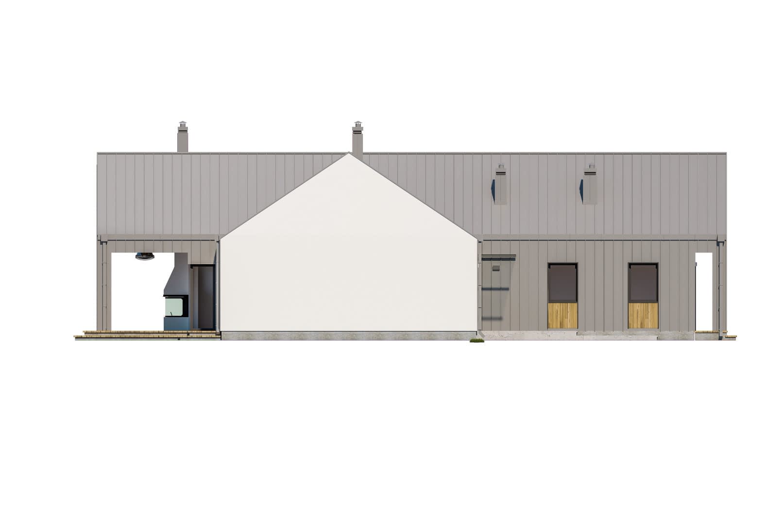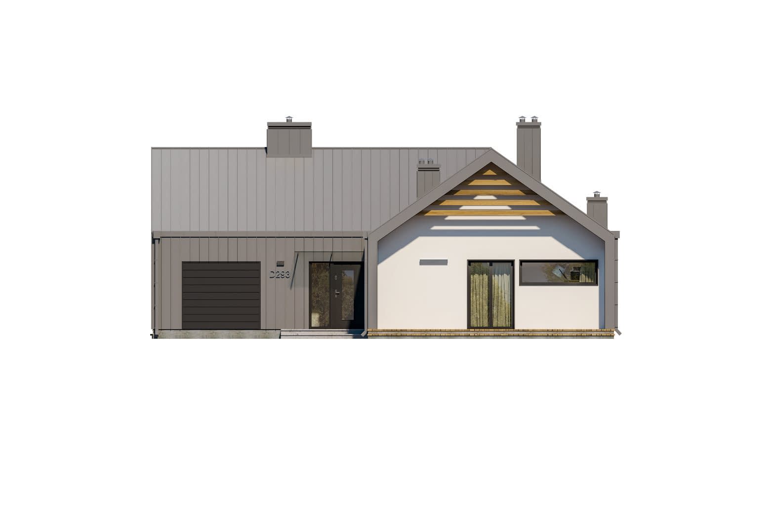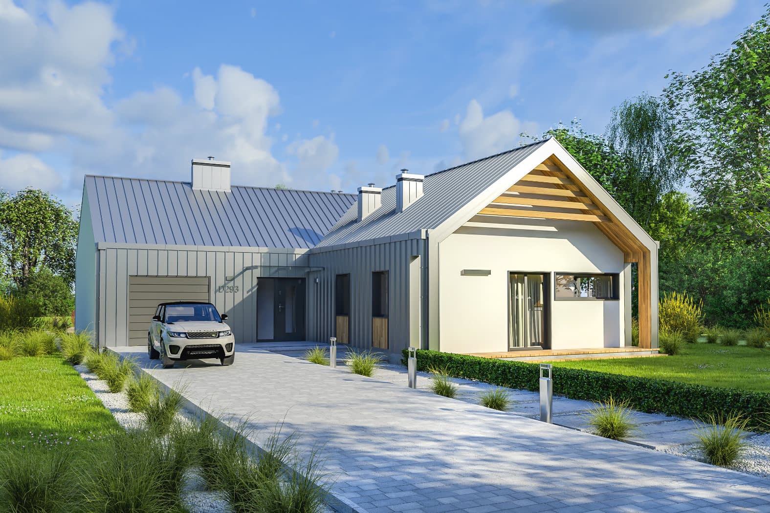 Nowoczesny, duży dom parterowy z garażem. Projekt domu oferuje trzy pokoje sypialniane, przestronny pokój dzienny połączony z kuchnią i jadalnią oraz trzy łazienki. Atutem domu są schowki, garderoby, spiżarnia oraz dwa duże tarasy.Konstrukcja
