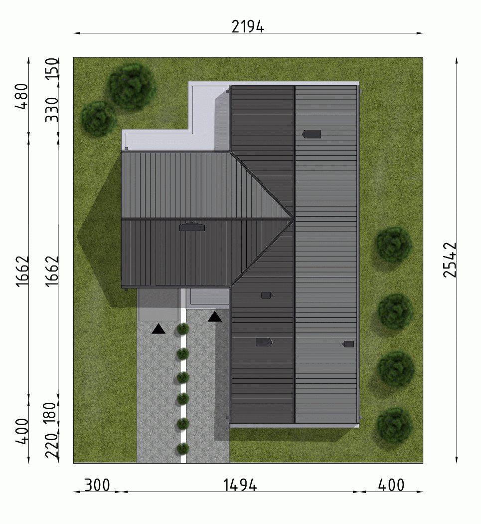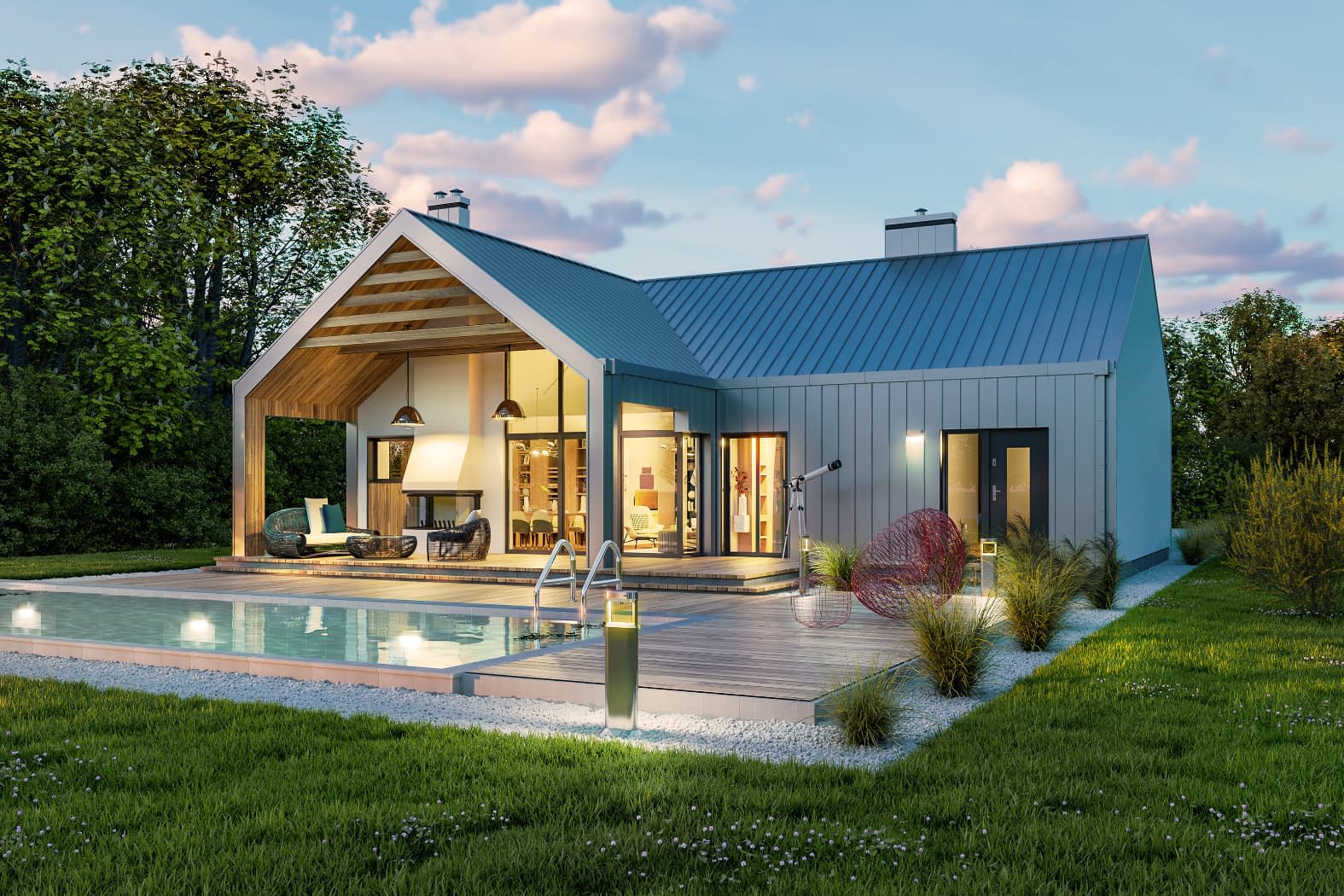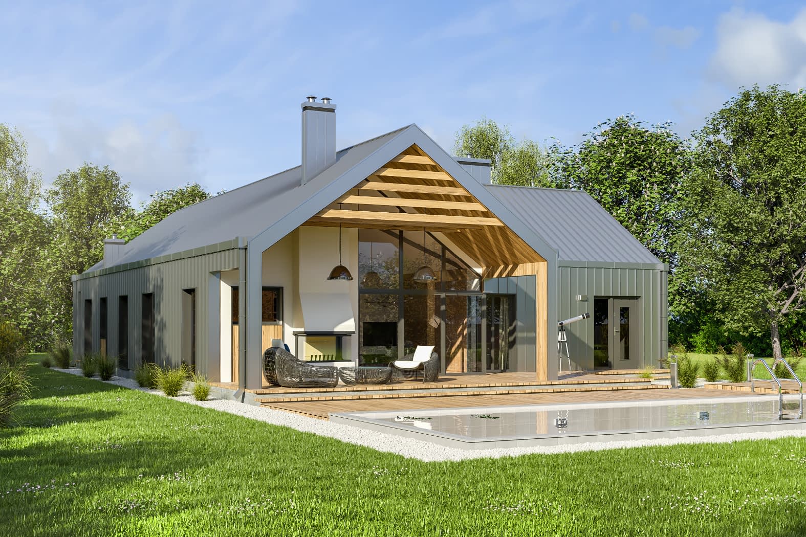 - elewacje (frontowa, dwie elewacje boczne, ogrodowa) – dokładny wygląd domu z każdej strony.