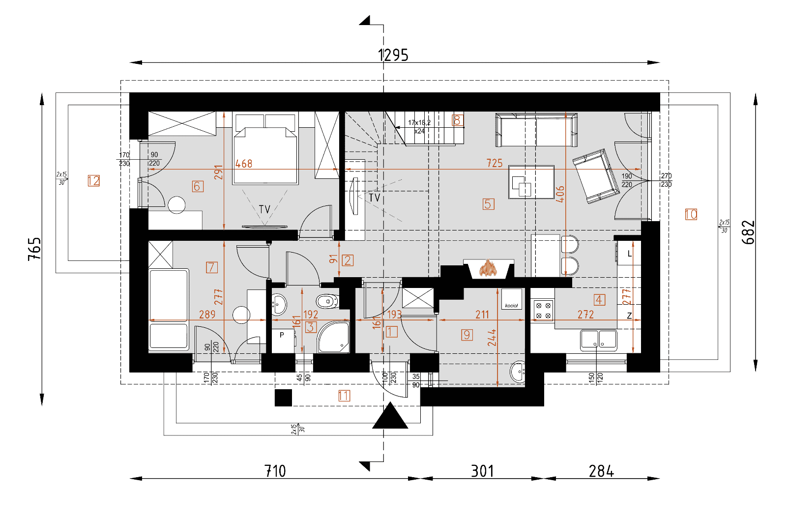 - rzuty wszystkich kondygnacji (np. parter, piwnica, piętro) – rozmieszczenie i wymiary wszystkich pomieszczeń, rozmieszczenie i wielkość otworów okiennych i drzwiowych, rozmieszczenie kominów, sugerowana aranżacja wnętrz.