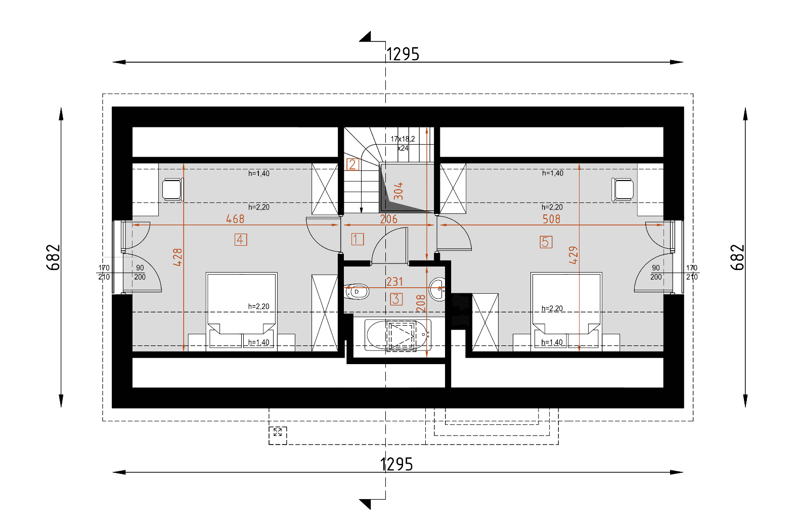 Niewielki dom z poddaszem użytkowym: 4 pokoje, 2 łazienki, kotłownia. Dom mieszkalny jednorodzinny wolnostojący, parterowy z poddaszem użytkowym. Parter składa się z pokoju dziennego połączonego z kuchnią, łazienki, 2 pokoi sypialnych oraz pomieszczenia technicznego dostępnego z przedsionka. Na poddaszu znajdują się 2 pokoje. Budynek idealny na wąską działkę.Konstrukcja