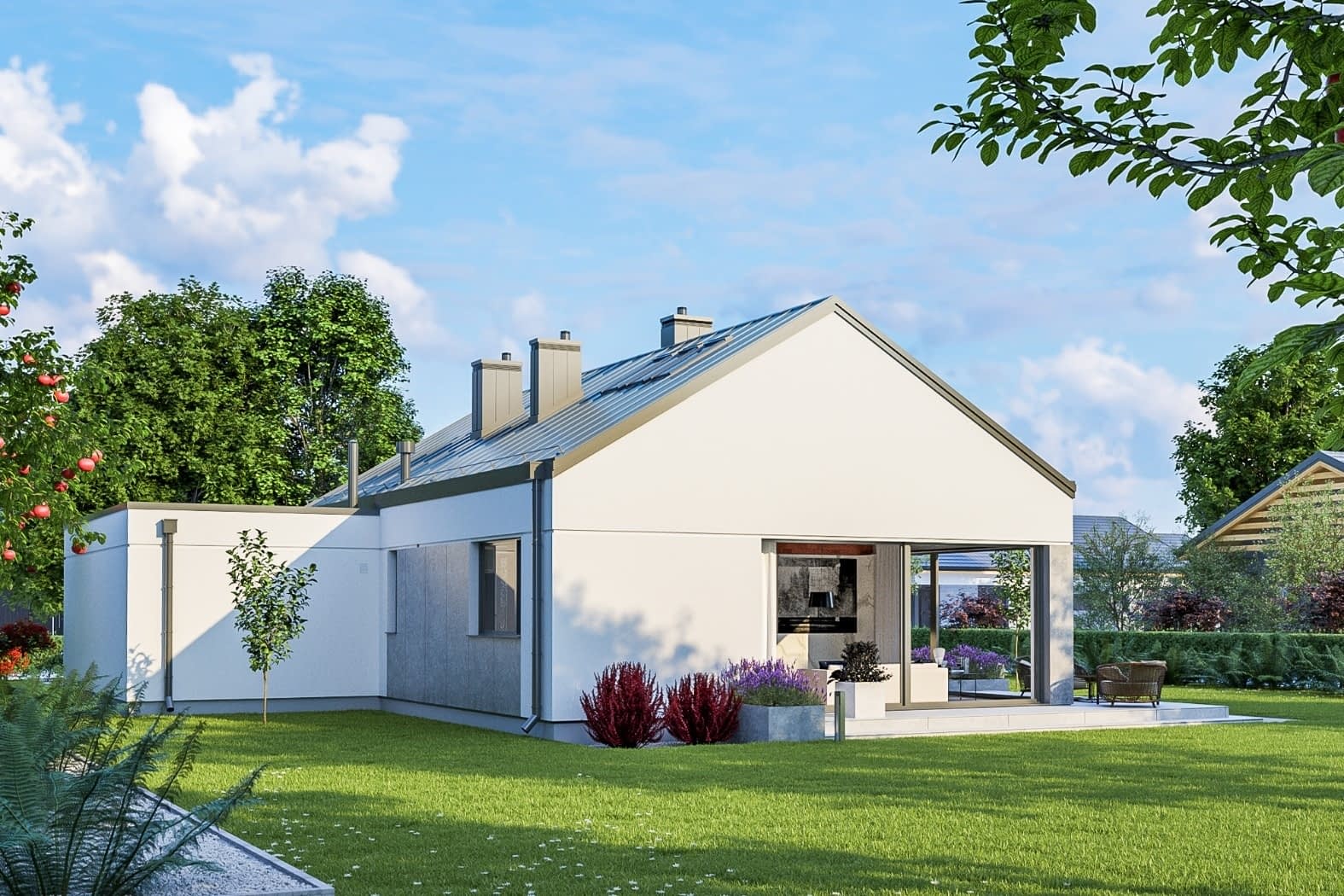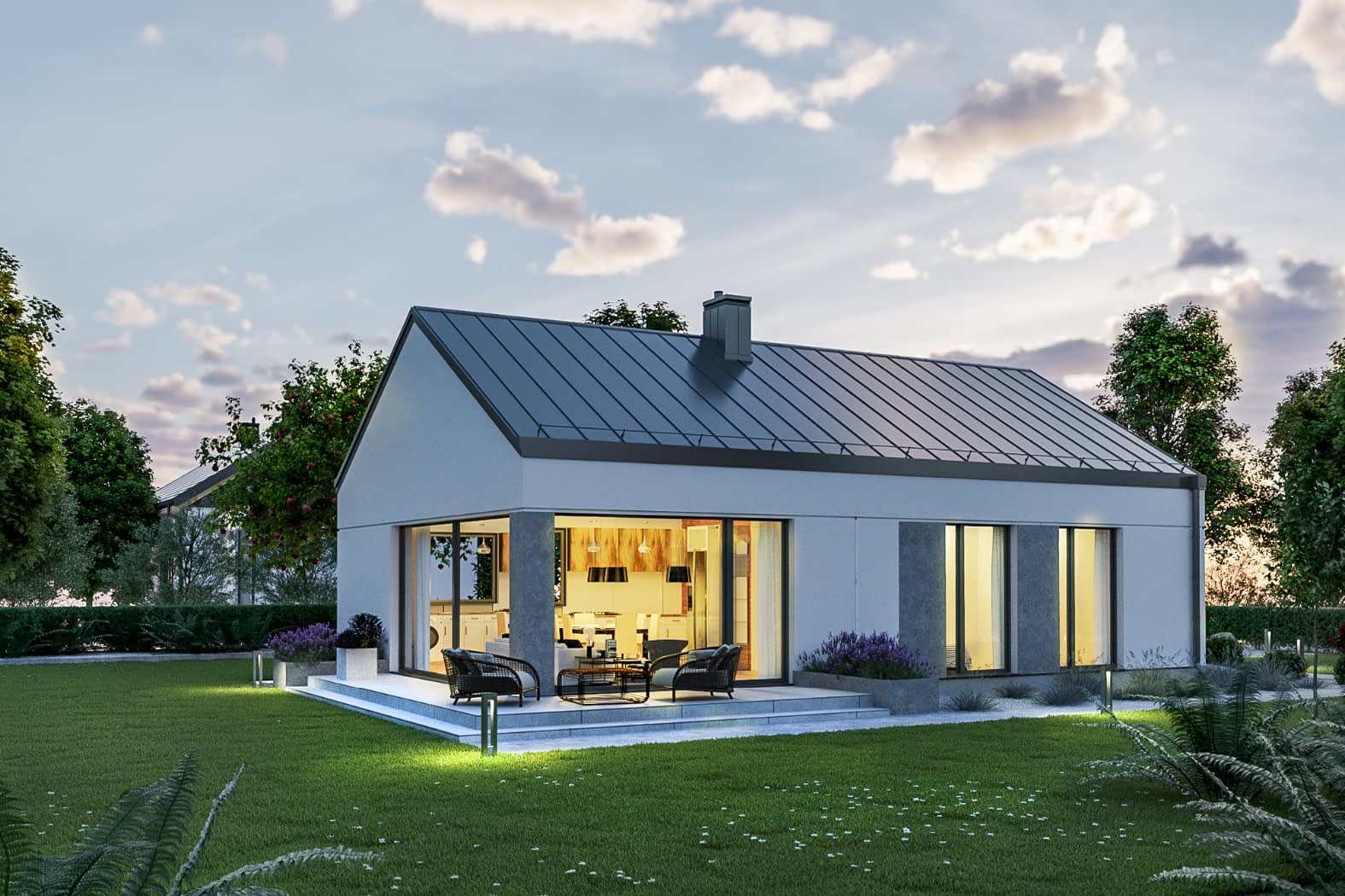 - elewacje (frontowa, dwie elewacje boczne, ogrodowa) – dokładny wygląd domu z każdej strony.