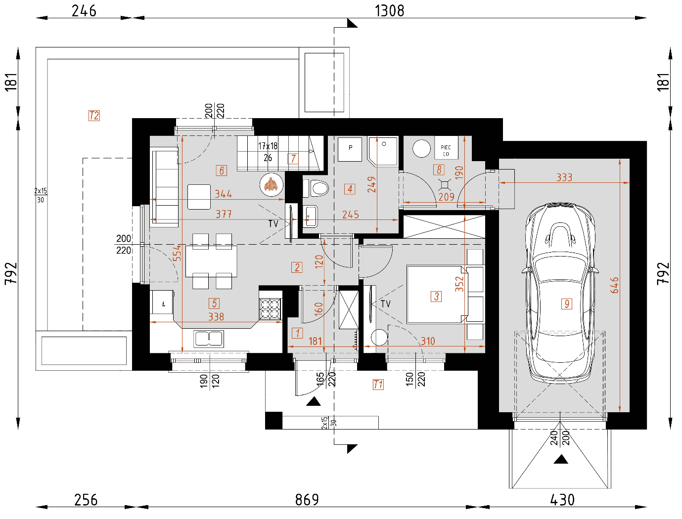 - rzuty wszystkich kondygnacji (np. parter, piwnica, piętro) – rozmieszczenie i wymiary wszystkich pomieszczeń, rozmieszczenie i wielkość otworów okiennych i drzwiowych, rozmieszczenie kominów, sugerowana aranżacja wnętrz.