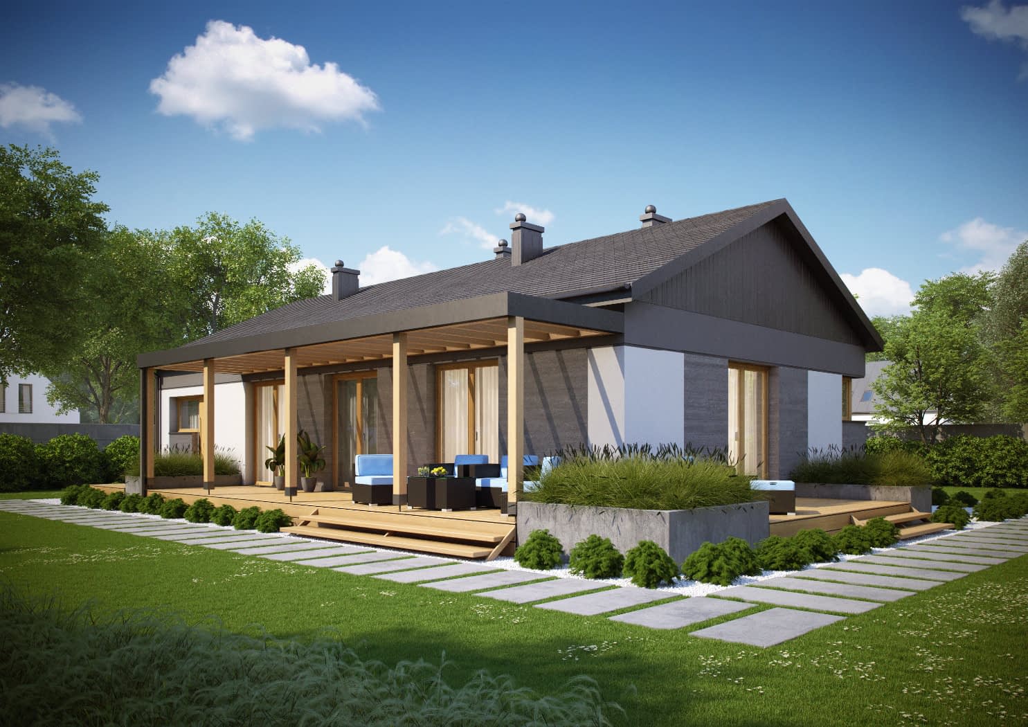 Nowoczesny, mały dom parterowy z garażem. Projekt domu oferuje trzy pokoje sypialniane, przestronny pokój dzienny połączony z kuchnią oraz łazienkę. Atutem domu są dwa duże tarasy wraz z przeszkleniami.Konstrukcja