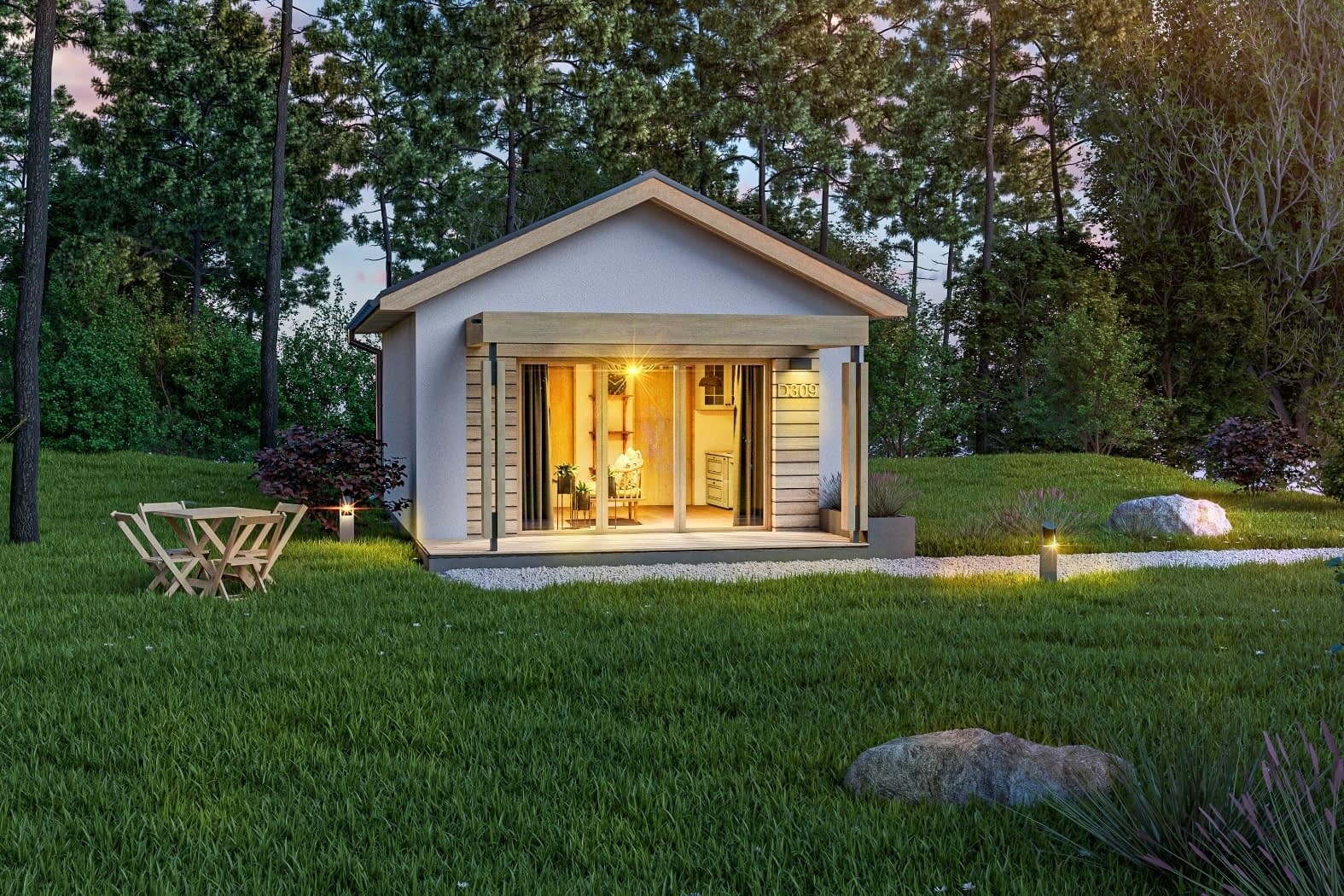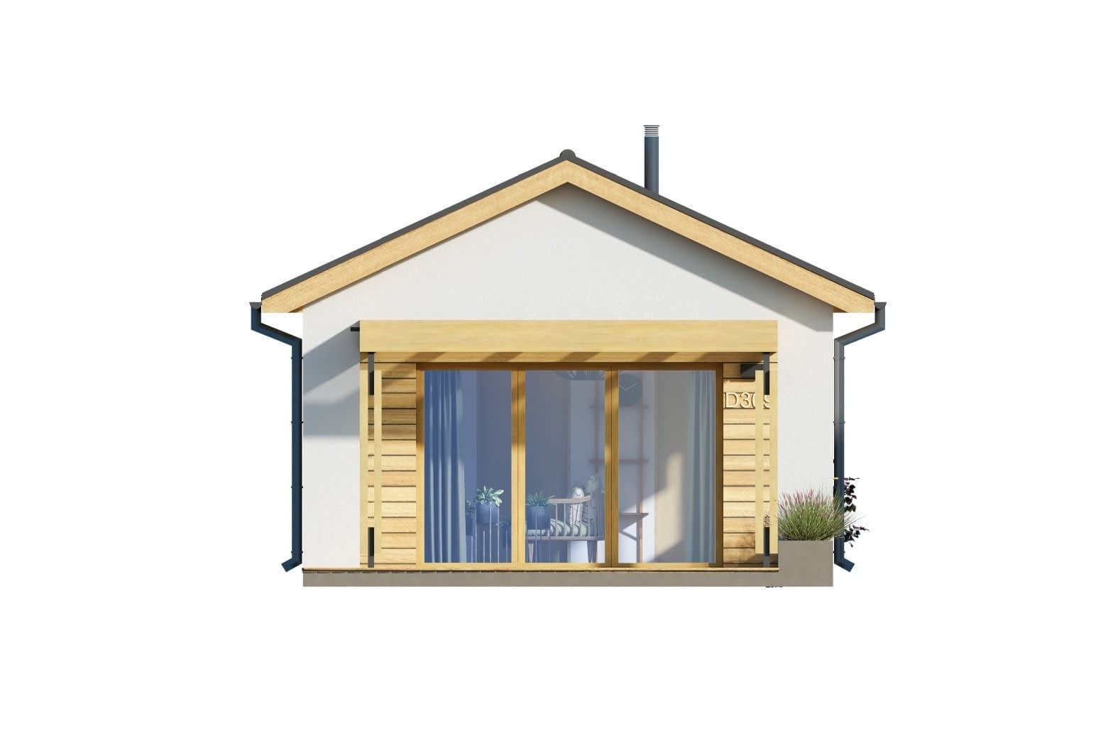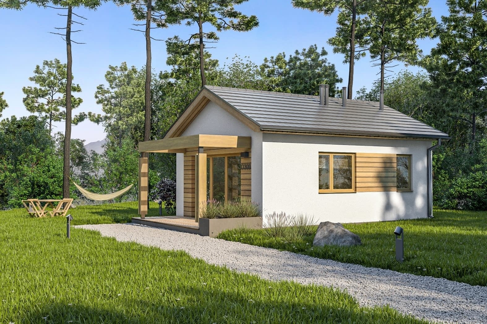 Projekt D309 jest nowoczesną formą nowoczesnego letniskowego domu rekreacji inywidualnej. Zadaszony ganek z elementami drewna idealnie wpisują się w otoczenie pełne zieleni. Domek na każda działkę, nawet o niewielkich rozmiarach.Konstrukcja