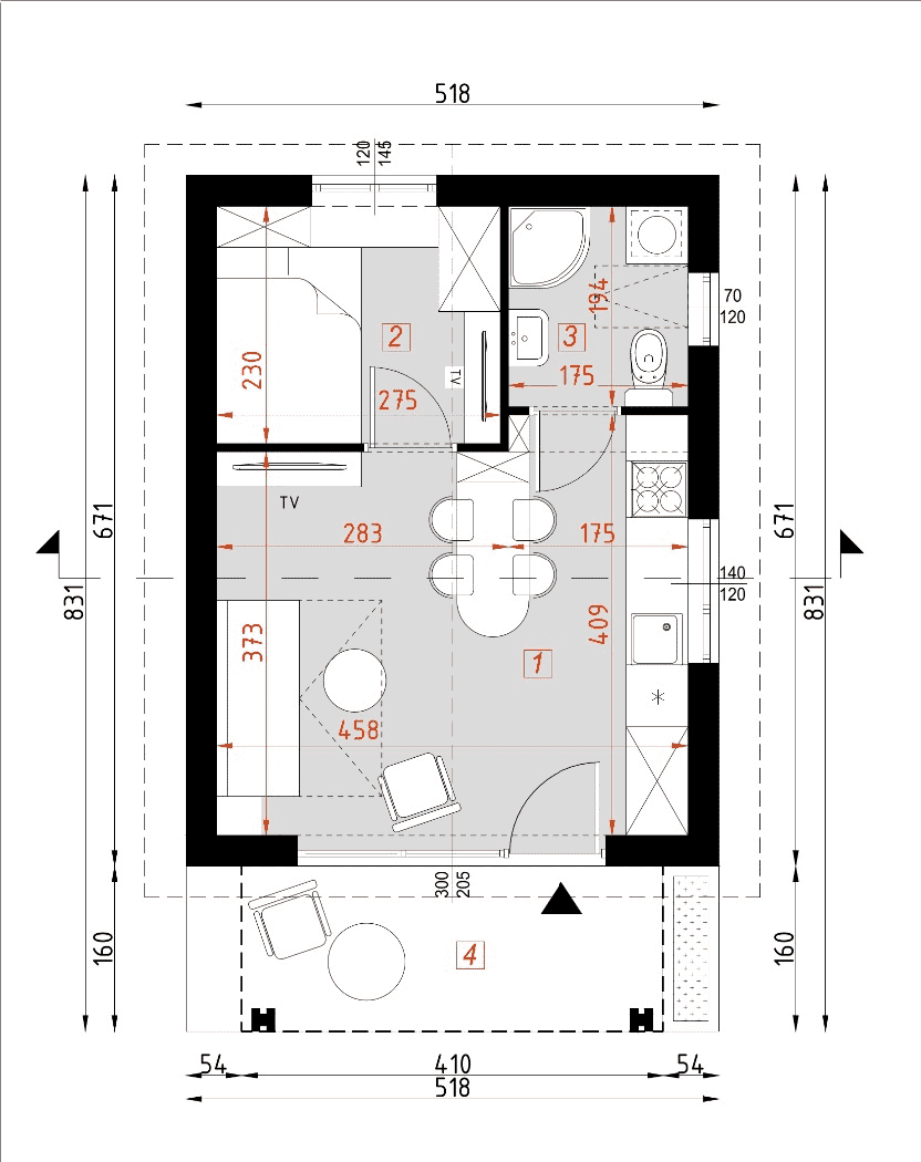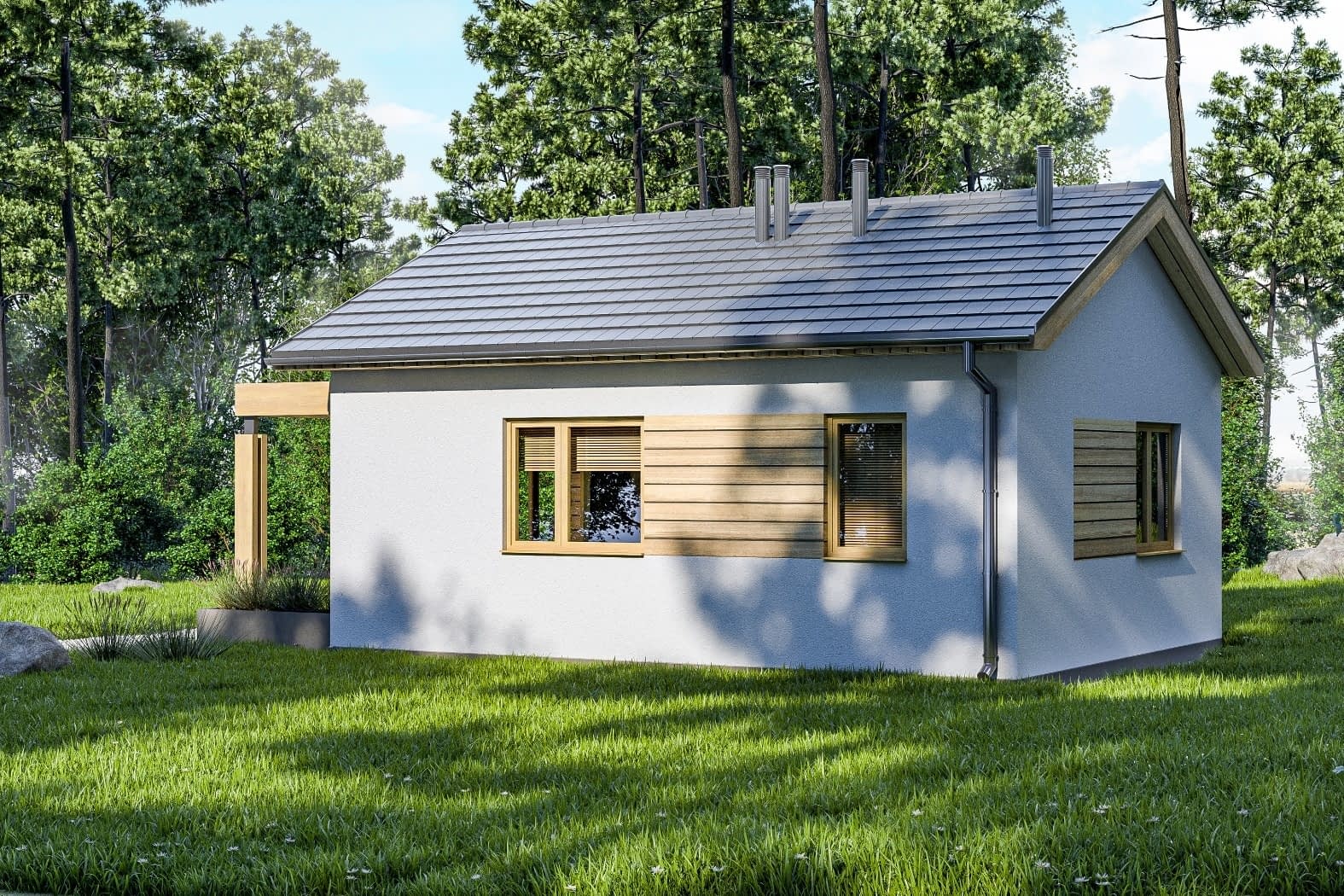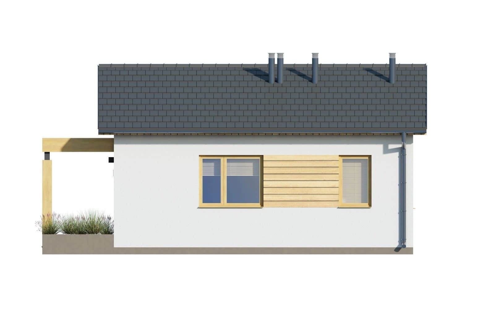 Projekt D309 jest nowoczesną formą nowoczesnego letniskowego domu rekreacji inywidualnej. Zadaszony ganek z elementami drewna idealnie wpisują się w otoczenie pełne zieleni. Domek na każda działkę, nawet o niewielkich rozmiarach.Konstrukcja