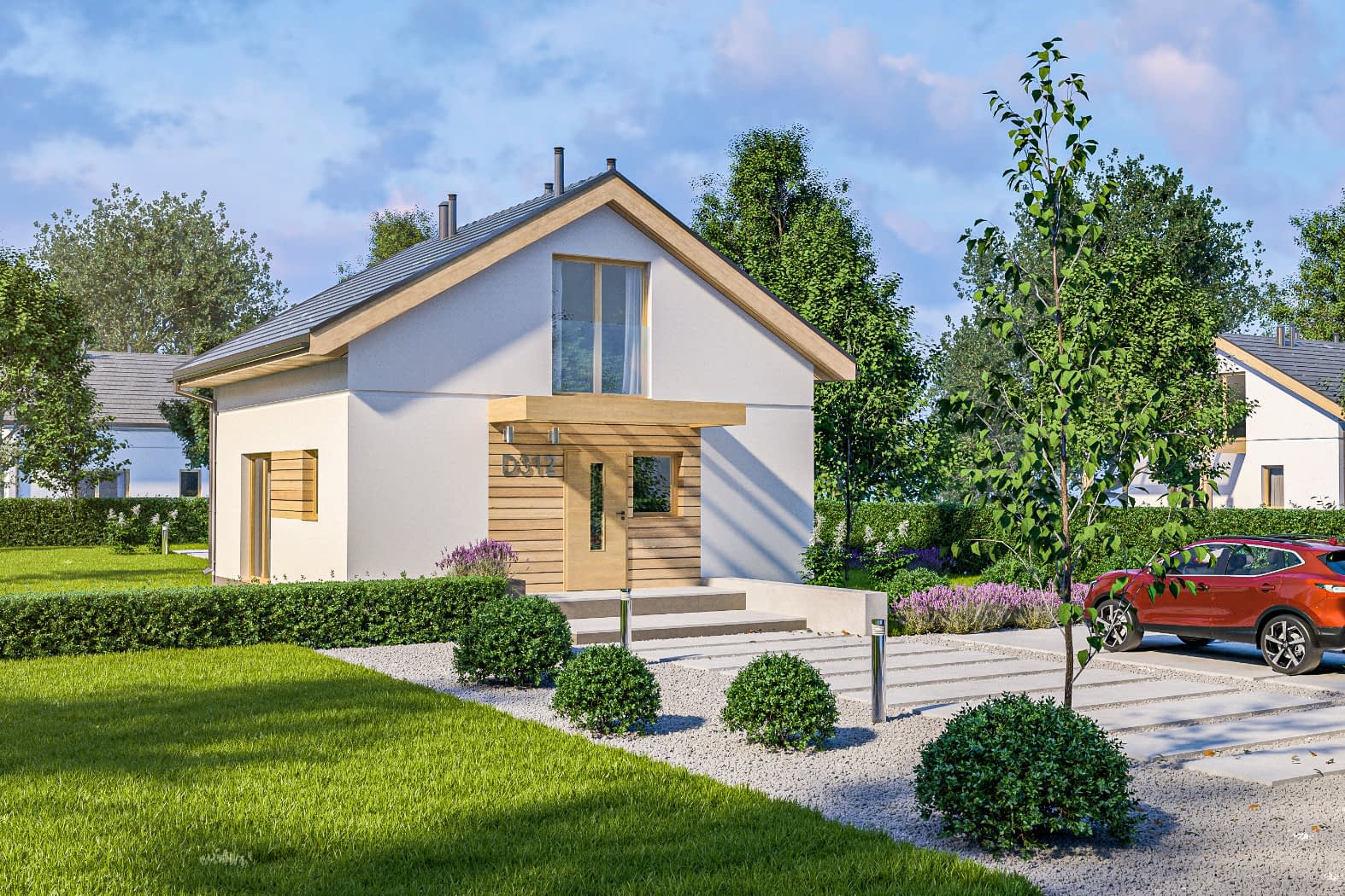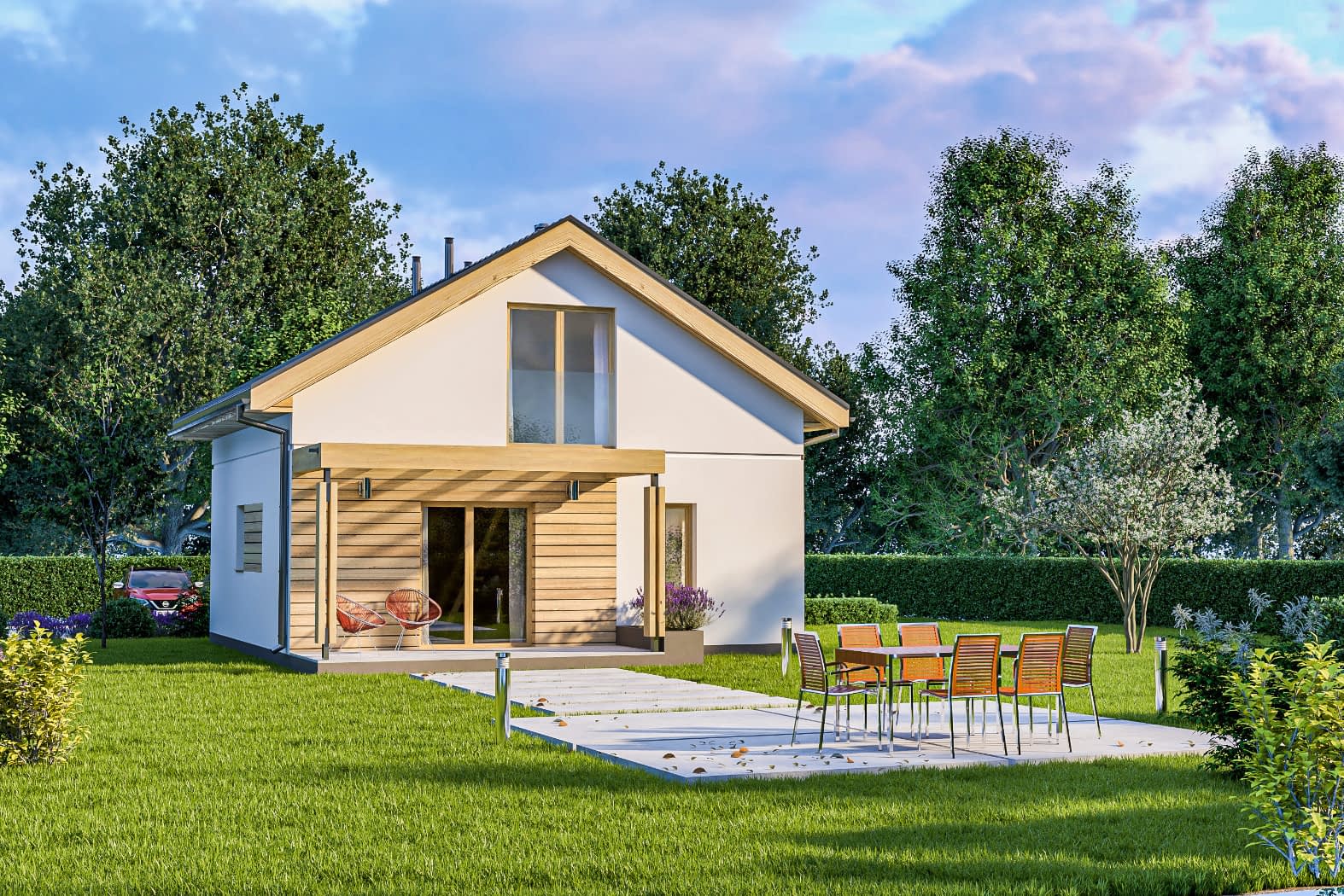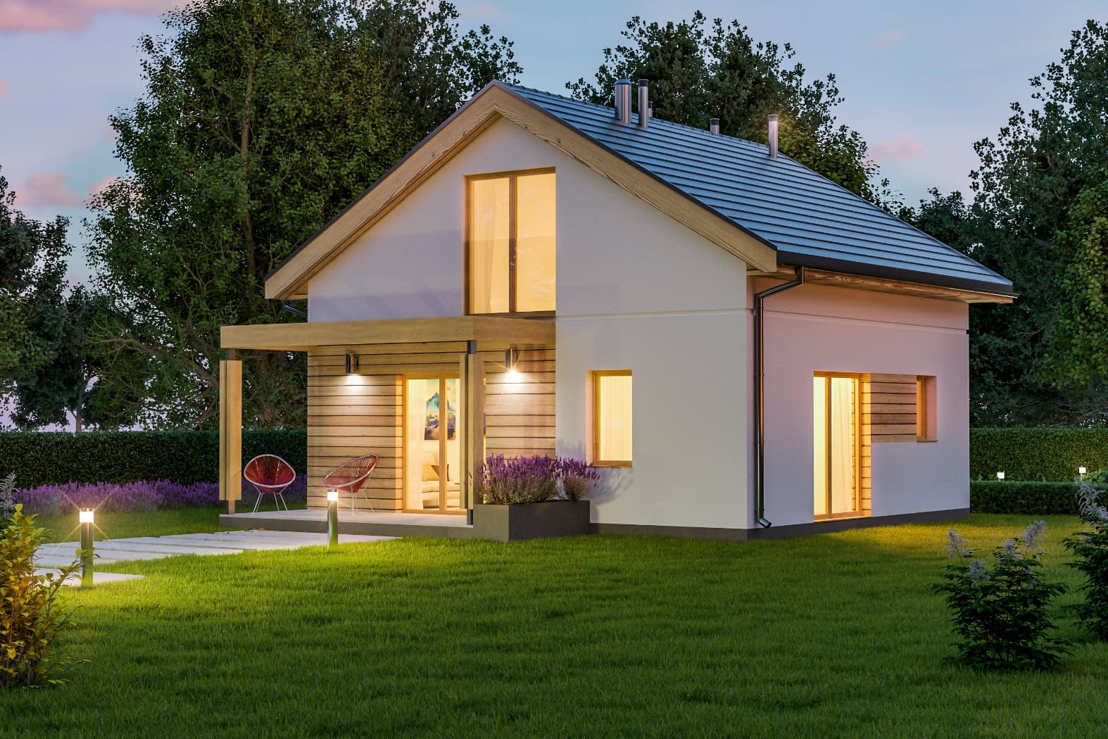 - elewacje (frontowa, dwie elewacje boczne, ogrodowa) – dokładny wygląd domu z każdej strony.