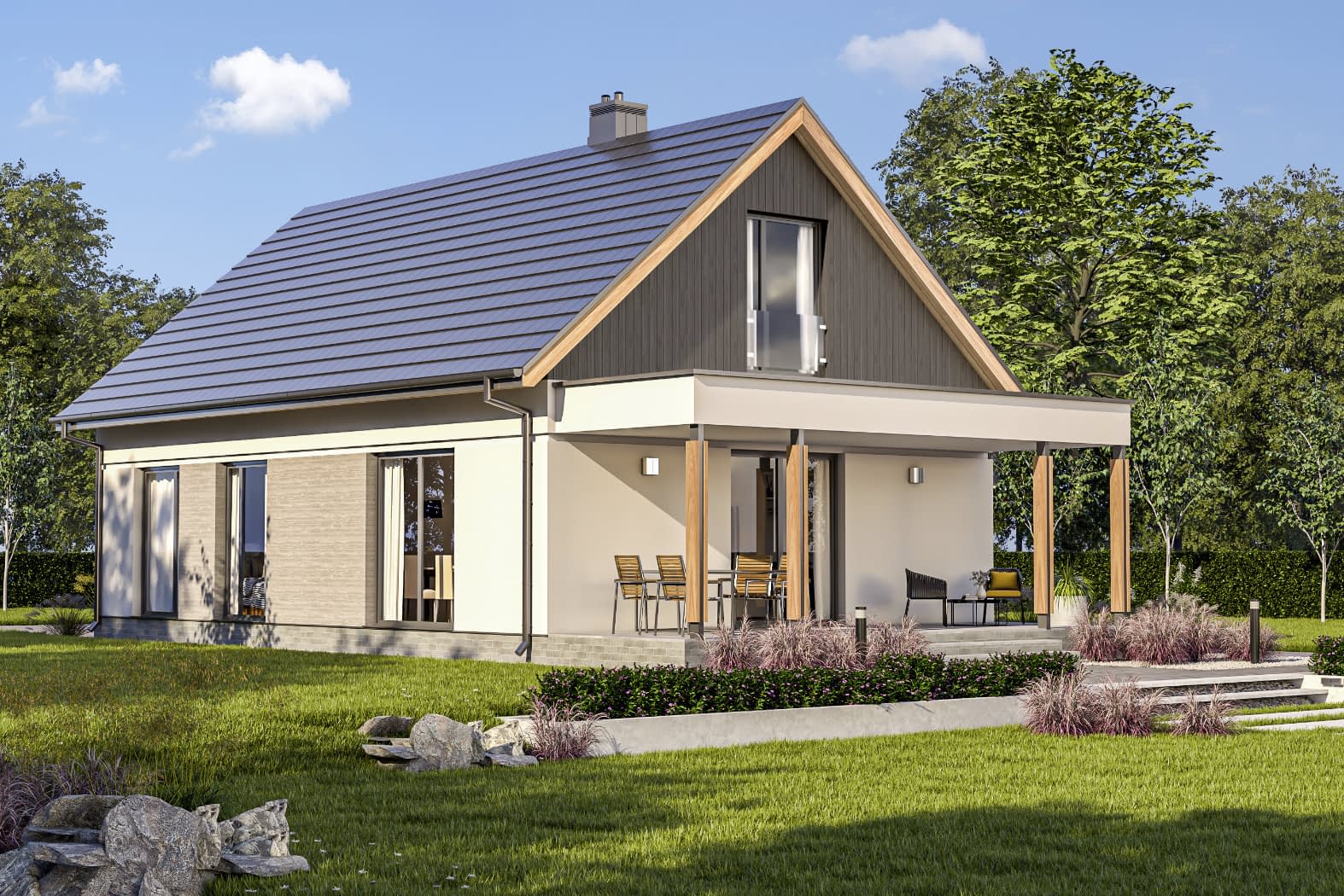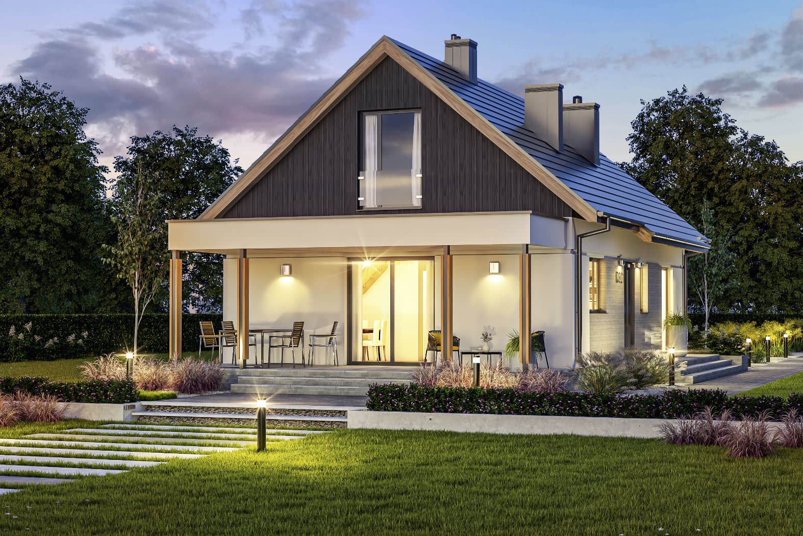 - elewacje (frontowa, dwie elewacje boczne, ogrodowa) – dokładny wygląd domu z każdej strony.