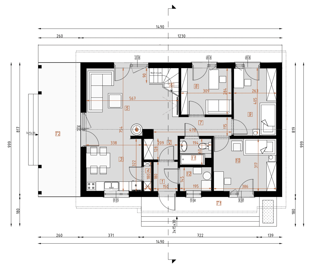 - rzuty wszystkich kondygnacji (np. parter, piwnica, piętro) – rozmieszczenie i wymiary wszystkich pomieszczeń, rozmieszczenie i wielkość otworów okiennych i drzwiowych, rozmieszczenie kominów, sugerowana aranżacja wnętrz.
