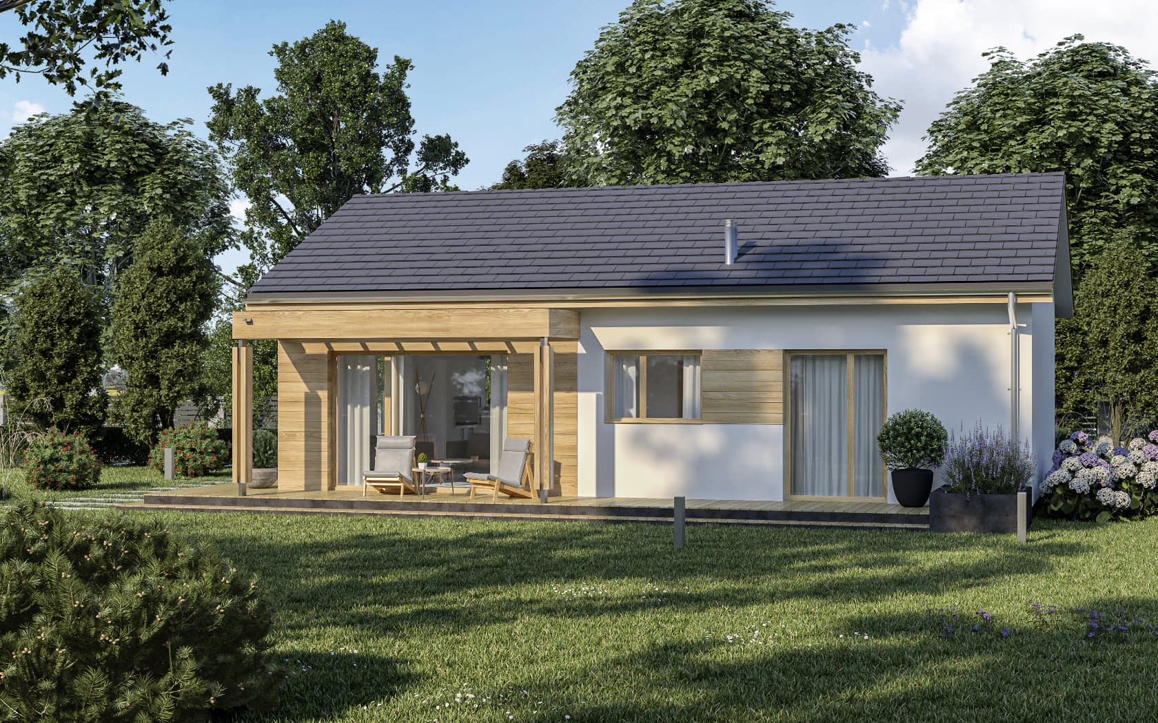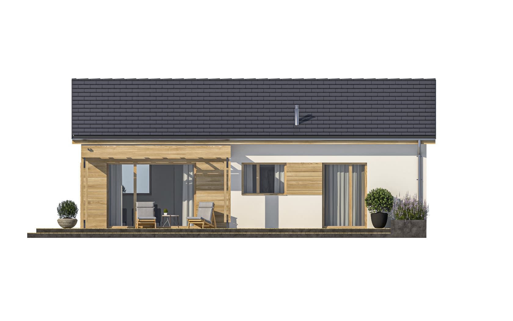 Elewacja: tynk cienkowarstwowy, drewno