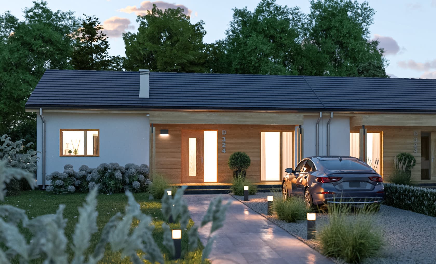 D324 WT2021 niewielki dom parterowy całoroczny, w zabudowie bliźniaczej.Konstrukcja