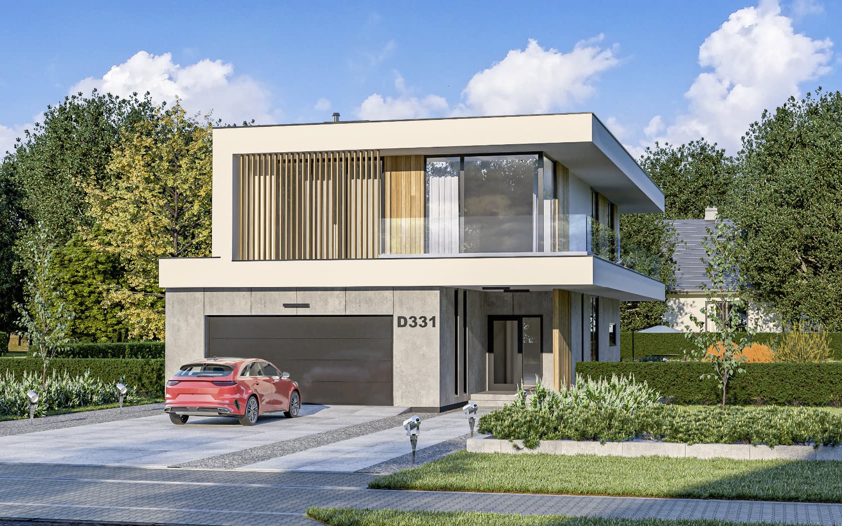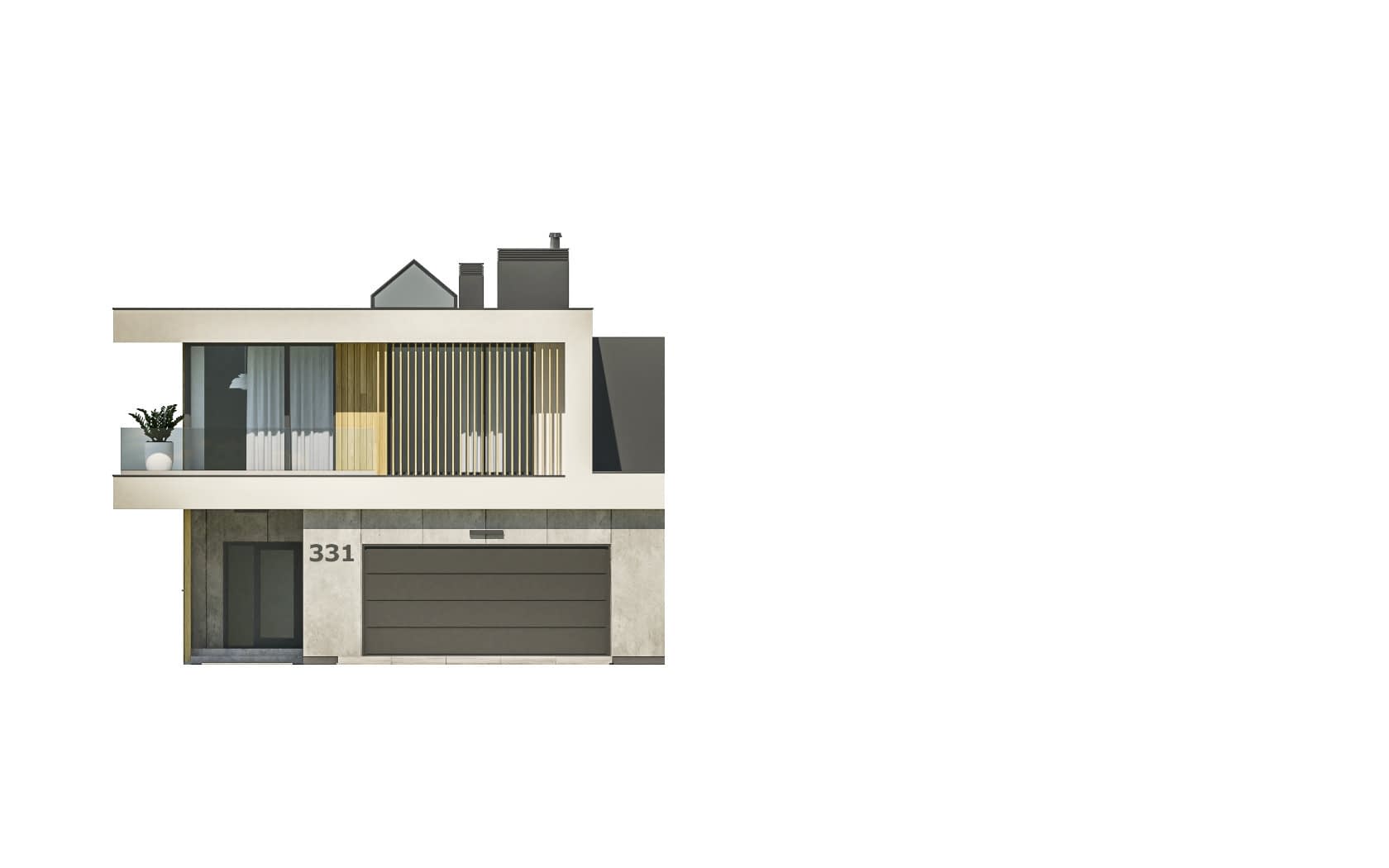 Układ funkcjonalny budynku: Kondygnacja parteru, każdego z lokali składa się z przedsionka wejściowego, salonu z jadalnią oraz kuchnią, łazienki, gabinetu, kotłowni oraz garażu dwustanowiskowego Kondygnacja piętra każdego z lokali składa się z głównej sypialni z łazienką oraz garderobą, trzech pokoi sypialnianych, łazienki, pralni, oraz korytarza z klatką schodową łączącego pomieszczenia. Całość zabudowy okala taras zewnętrzny. D331A to wersja tego projektu w zbliźniaczeniu. WYSOKOŚĆ BUDYNKU (od poz. posadzki parteru +/-0.00 do świetlika) 7,76 m WYSOKOŚĆ BUDYNKU (od poz. terenu do świetlika) MAX. 8,10 m WYSOKOŚĆ BUDYNKU (od poz. terenu do dachu płaskiego) MAX. 7,20 mKonstrukcja