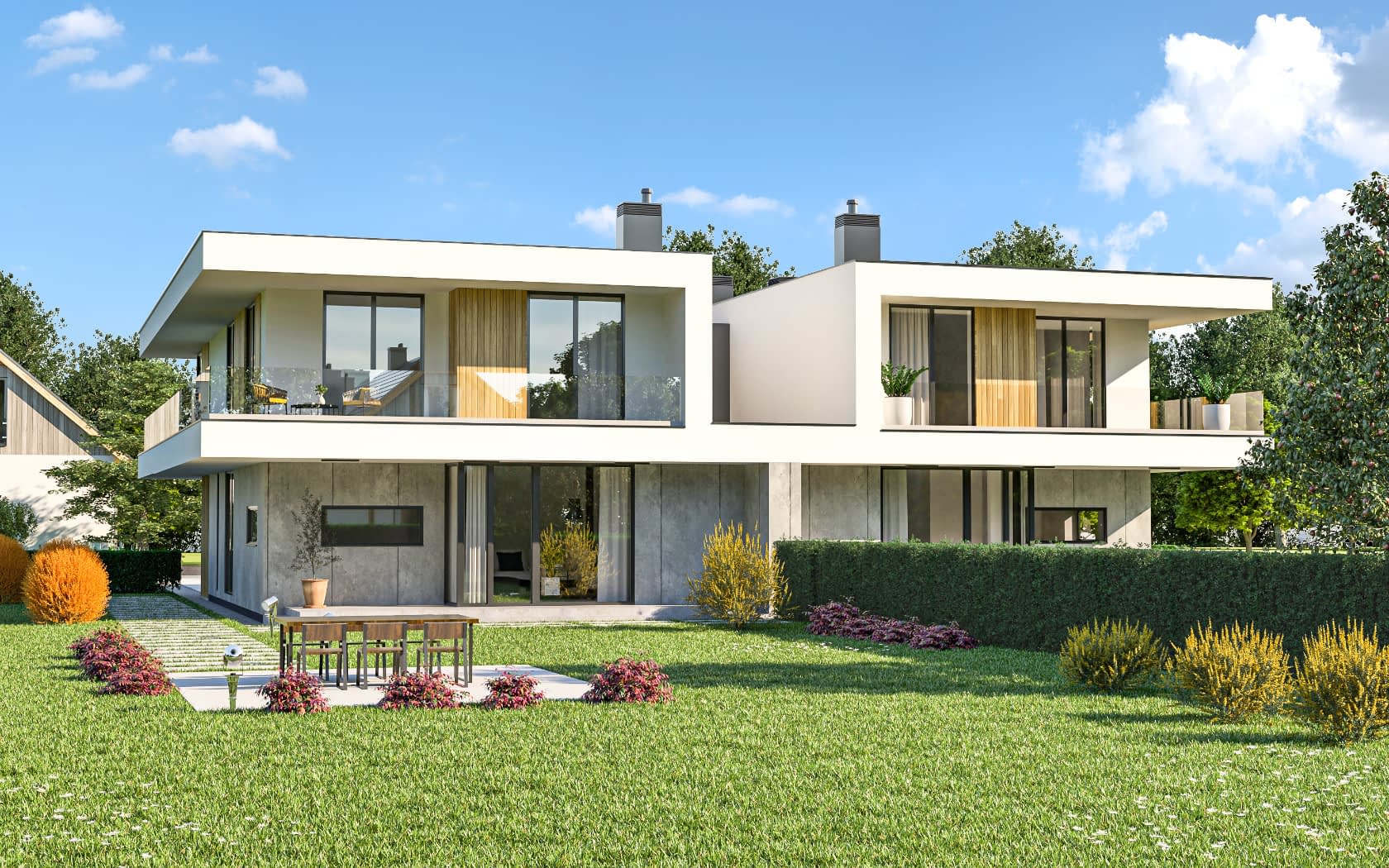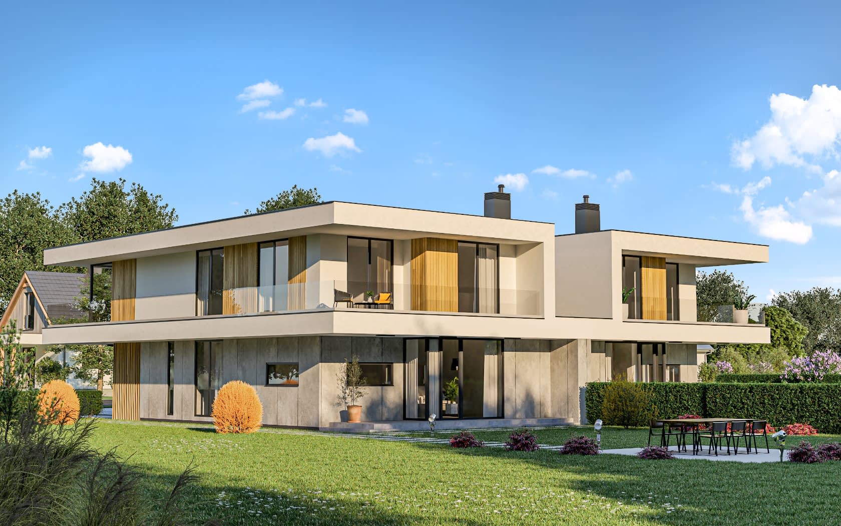 Elewacja: tynk żywiczny ciągniony, tynk imitujący drewno, drewno elewacyjne.