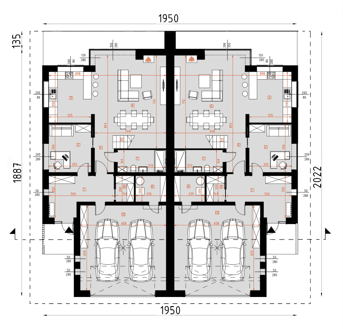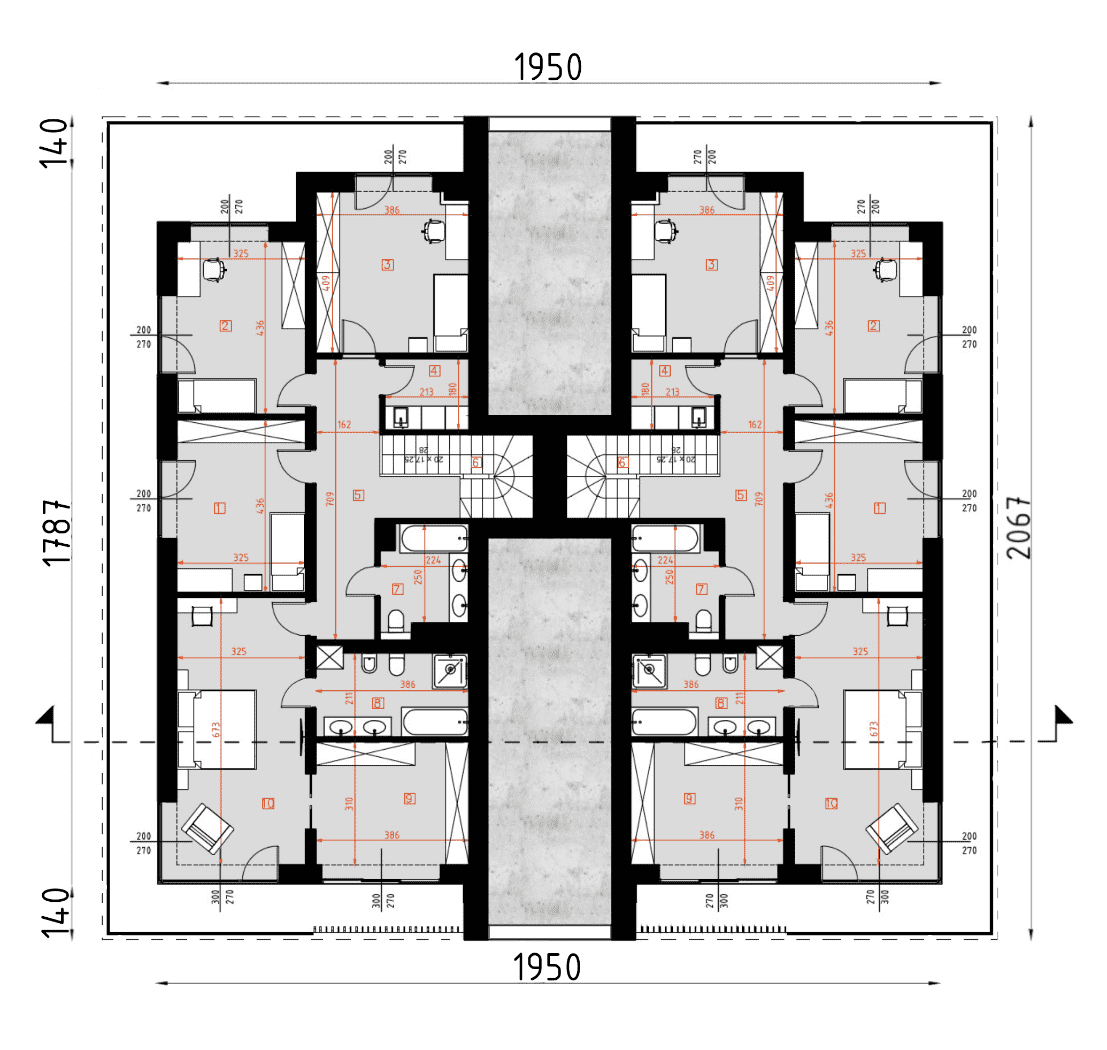 Układ funkcjonalny budynku: Kondygnacja parteru, każdego z lokali składa się z przedsionka wejściowego, salonu z jadalnią oraz kuchnią, łazienki, gabinetu, kotłowni oraz garażu dwustanowiskowego Kondygnacja piętra każdego z lokali składa się z głównej sypialni z łazienką oraz garderobą, trzech pokoi sypialnianych, łazienki, pralni, oraz korytarza z klatką schodową łączącego pomieszczenia. Całość zabudowy okala taras zewnętrzny. D331 to wersja tego projektu połówka bliźniaka. WYSOKOŚĆ BUDYNKU (od poz. posadzki parteru +/-0.00 do świetlika) 7,76 m WYSOKOŚĆ BUDYNKU (od poz. terenu do świetlika) MAX. 8,10 m WYSOKOŚĆ BUDYNKU (od poz. terenu do dachu płaskiego) MAX. 7,20 mKonstrukcja