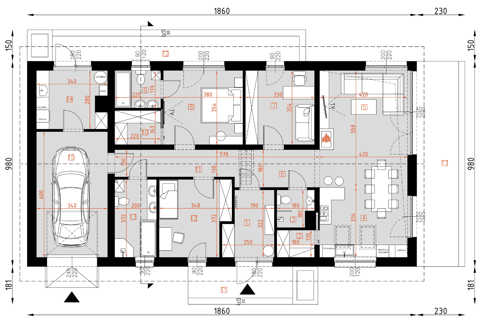 - rzuty wszystkich kondygnacji (np. parter, piwnica, piętro) – rozmieszczenie i wymiary wszystkich pomieszczeń, rozmieszczenie i wielkość otworów okiennych i drzwiowych, rozmieszczenie kominów, sugerowana aranżacja wnętrz.