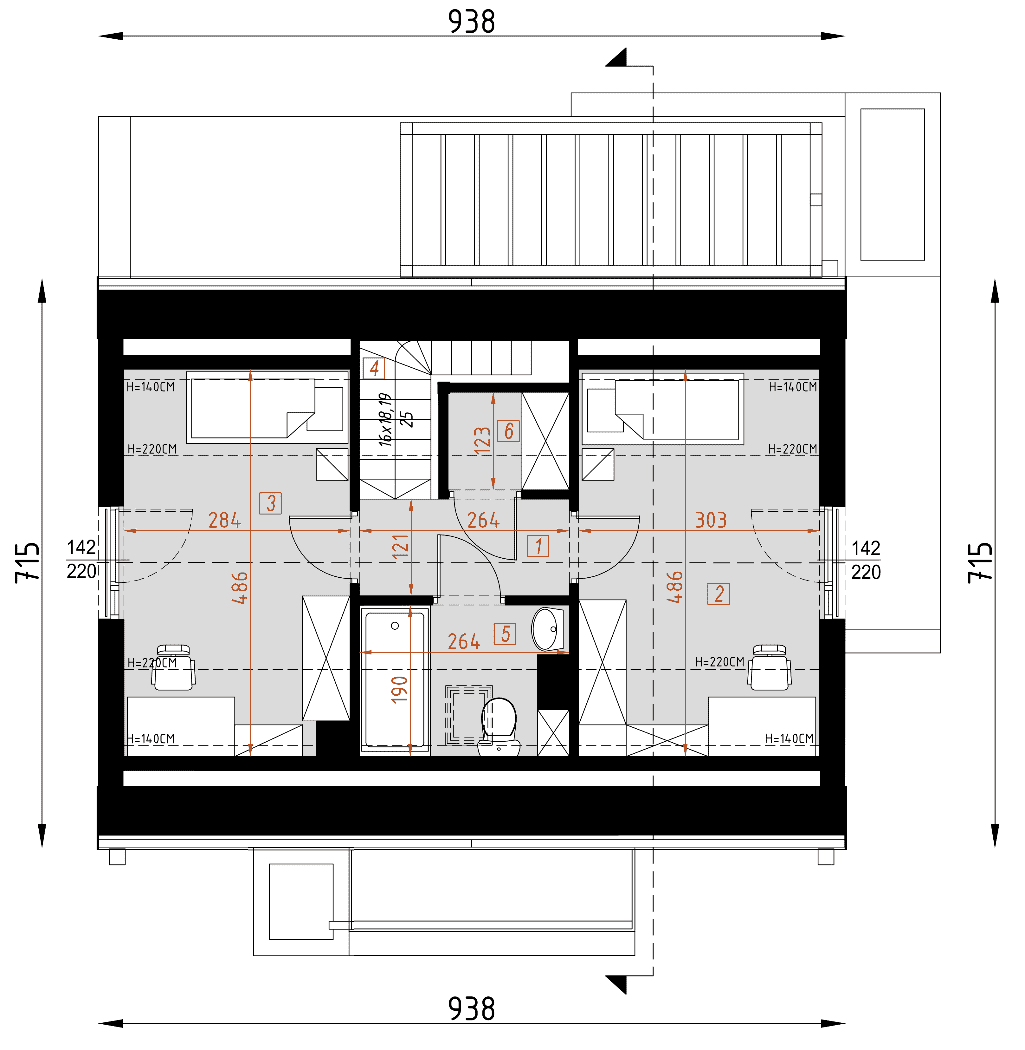 - rzut dachu – wymiary dachu, kąt nachylenia wszystkich połaci dachu, rozmieszczenie okien połaciowych, lukarn, kominów.