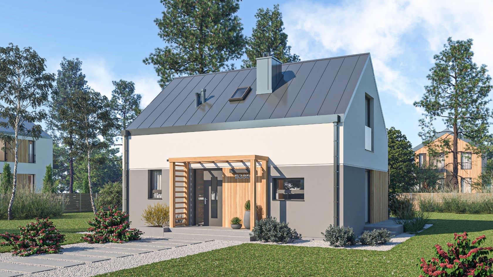Elewacja: tynk cienkowarstwowy, drewno