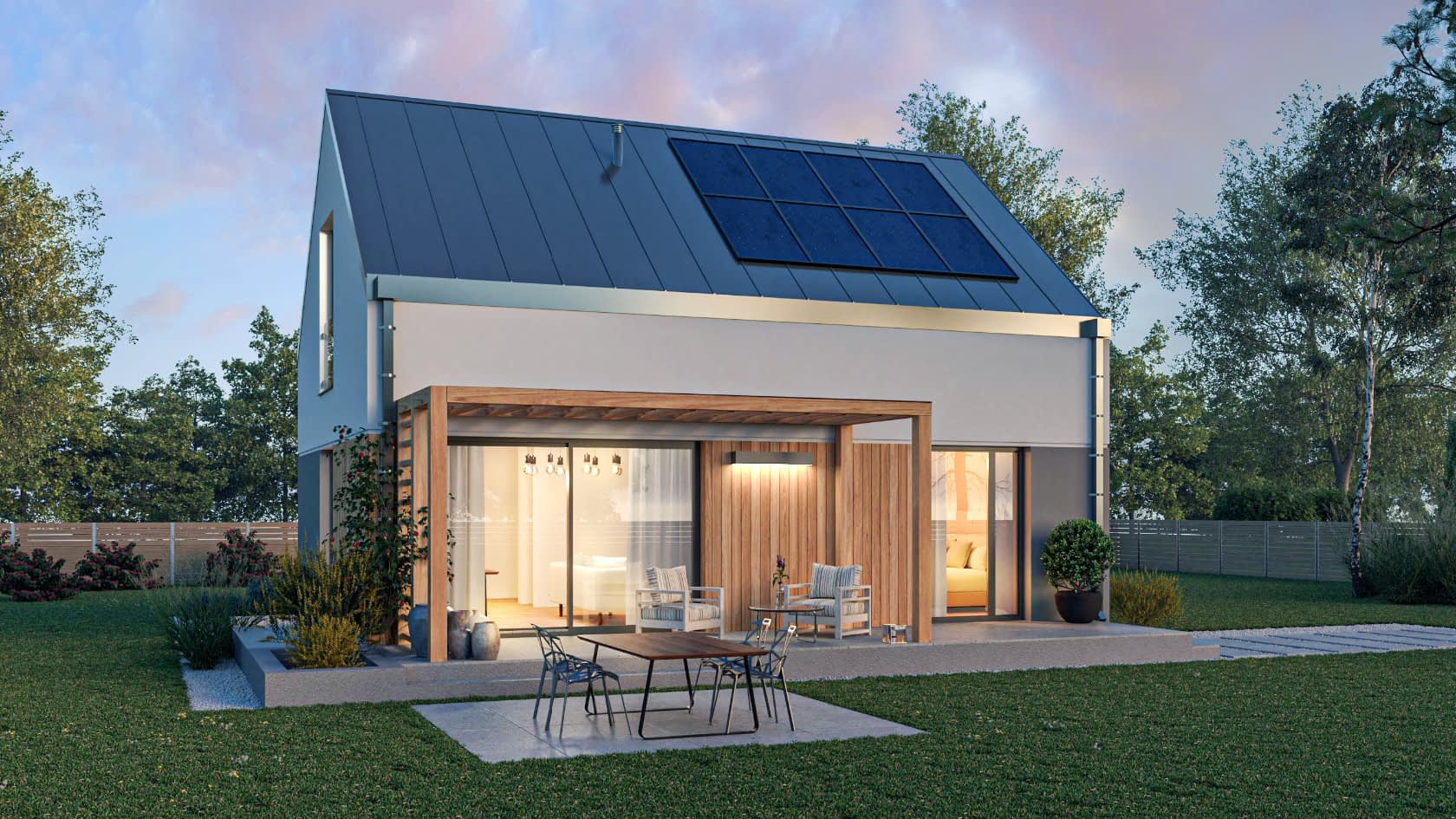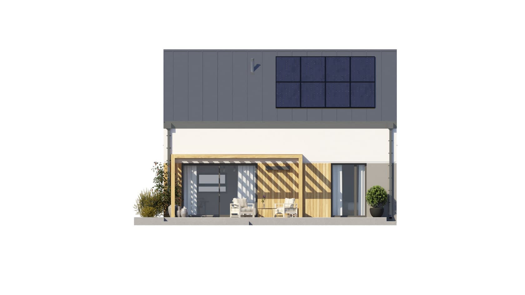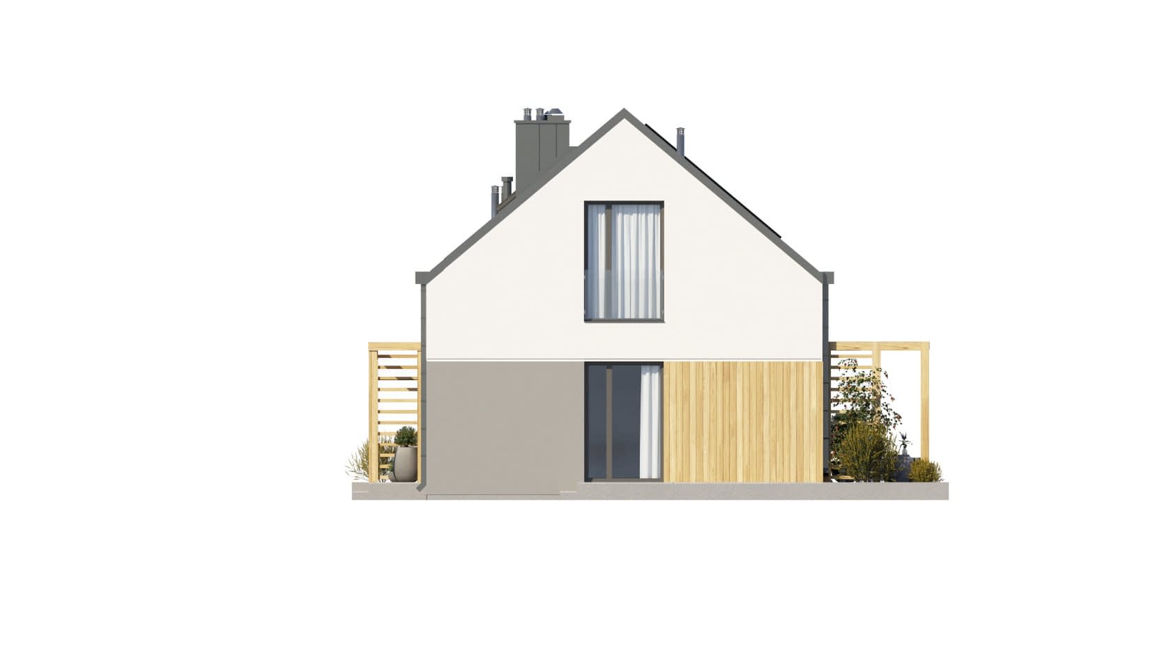 - elewacje (frontowa, dwie elewacje boczne, ogrodowa) – dokładny wygląd domu z każdej strony.