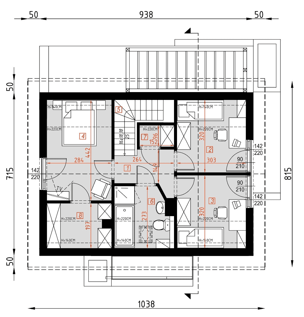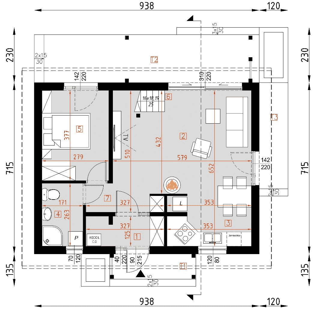 - rzuty wszystkich kondygnacji (np. parter, piwnica, piętro) – rozmieszczenie i wymiary wszystkich pomieszczeń, rozmieszczenie i wielkość otworów okiennych i drzwiowych, rozmieszczenie kominów, sugerowana aranżacja wnętrz.