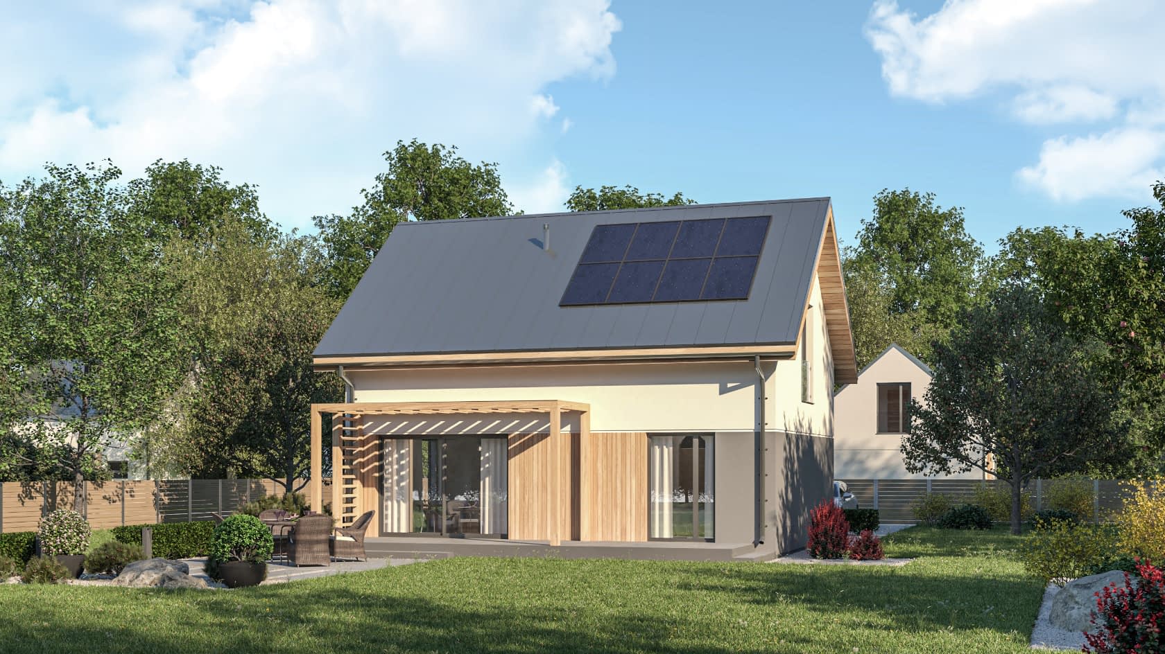 - elewacje (frontowa, dwie elewacje boczne, ogrodowa) – dokładny wygląd domu z każdej strony.