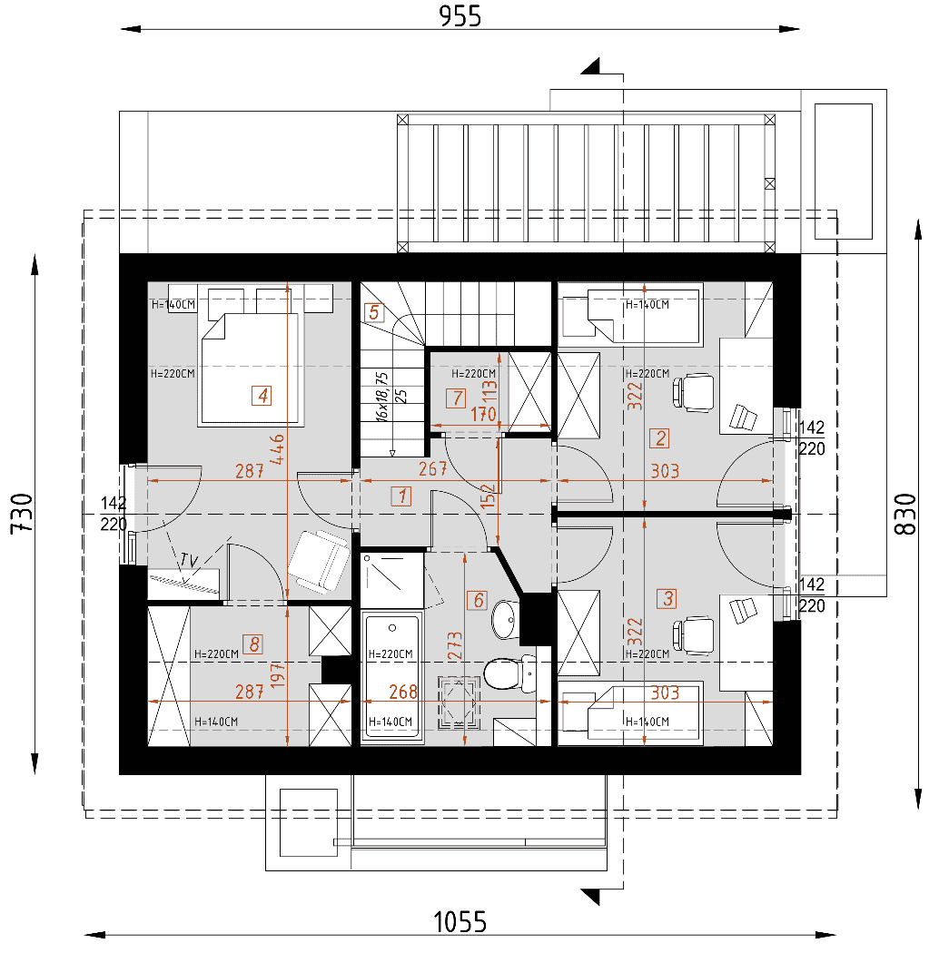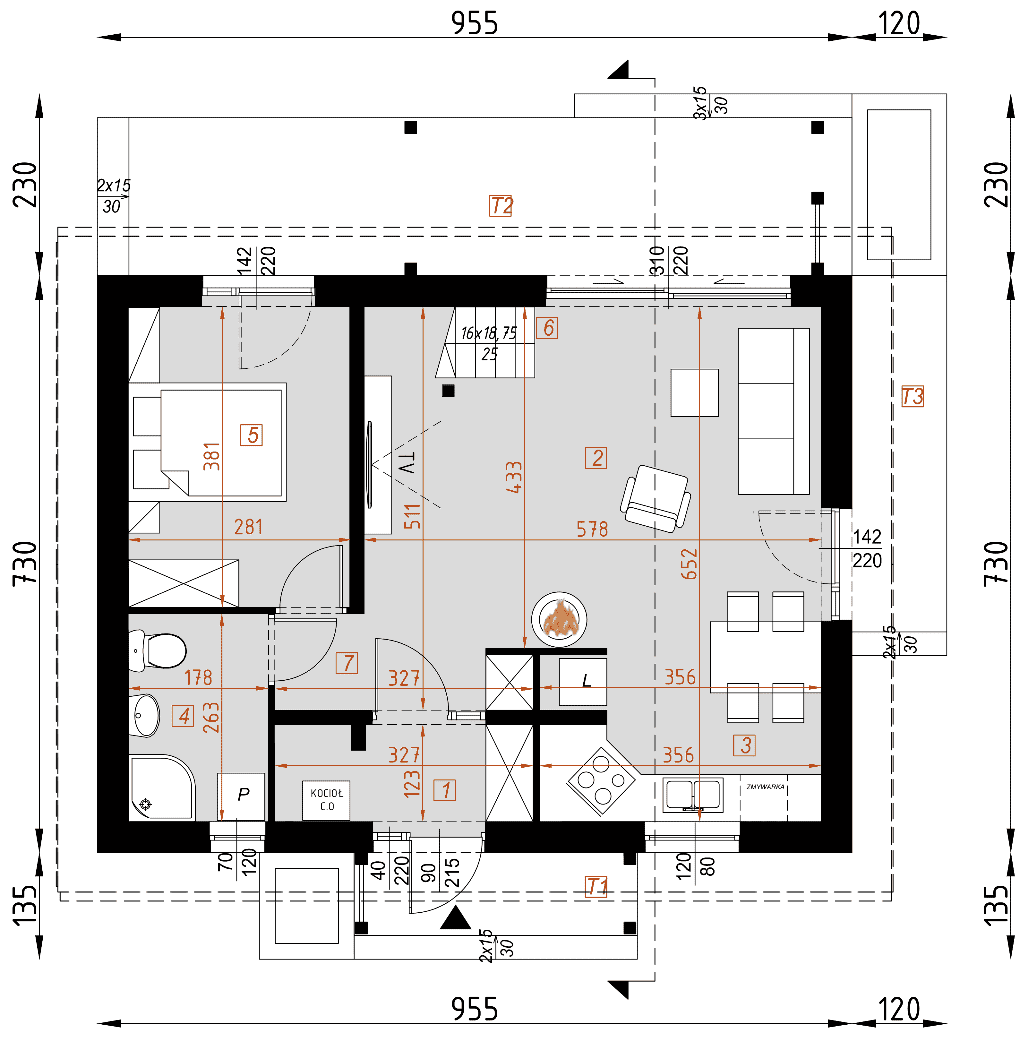 - rzuty wszystkich kondygnacji (np. parter, piwnica, piętro) – rozmieszczenie i wymiary wszystkich pomieszczeń, rozmieszczenie i wielkość otworów okiennych i drzwiowych, rozmieszczenie kominów, sugerowana aranżacja wnętrz.