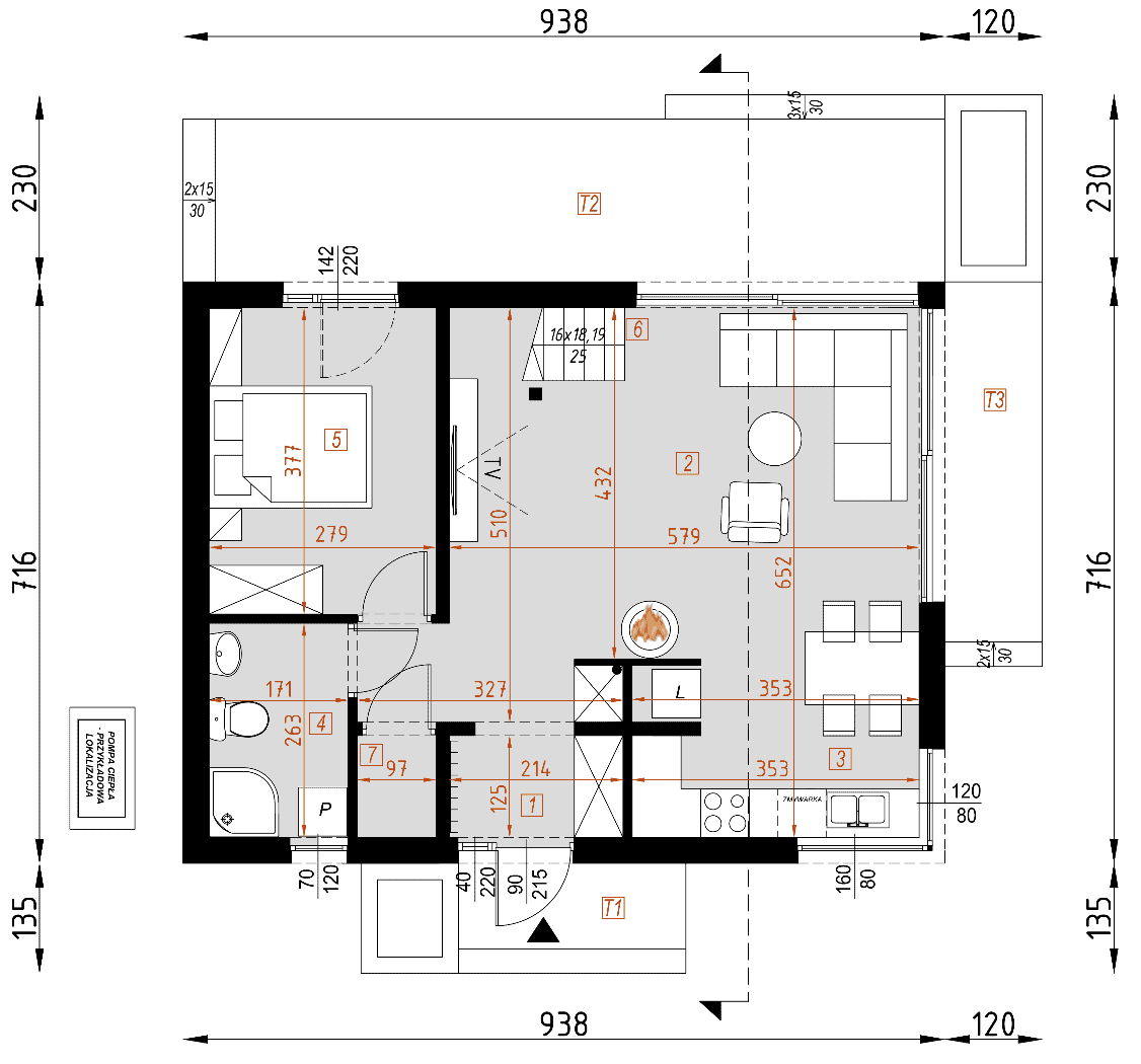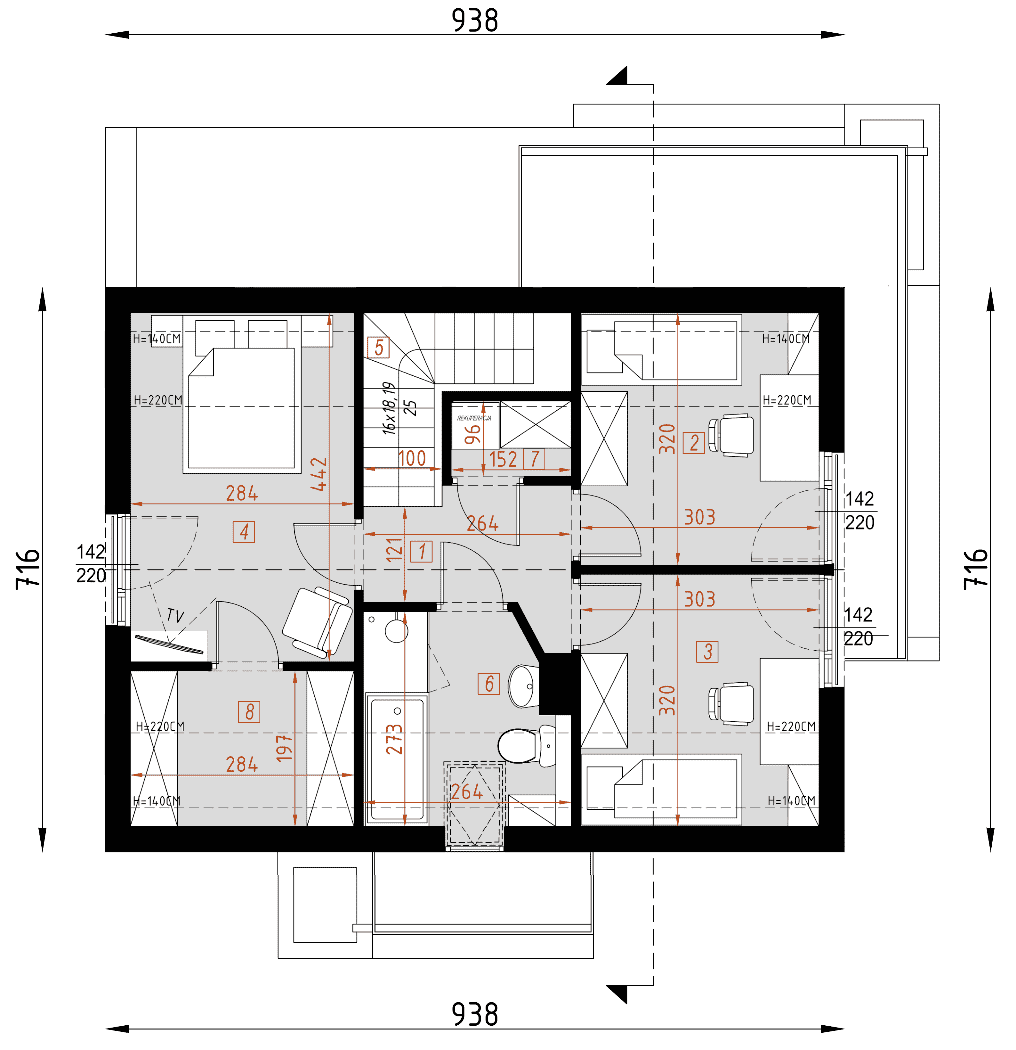 - rzuty wszystkich kondygnacji (np. parter, piwnica, piętro) – rozmieszczenie i wymiary wszystkich pomieszczeń, rozmieszczenie i wielkość otworów okiennych i drzwiowych, rozmieszczenie kominów, sugerowana aranżacja wnętrz.