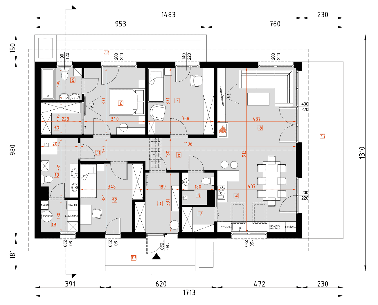 - rzuty wszystkich kondygnacji (np. parter, piwnica, piętro) – rozmieszczenie i wymiary wszystkich pomieszczeń, rozmieszczenie i wielkość otworów okiennych i drzwiowych, rozmieszczenie kominów, sugerowana aranżacja wnętrz.