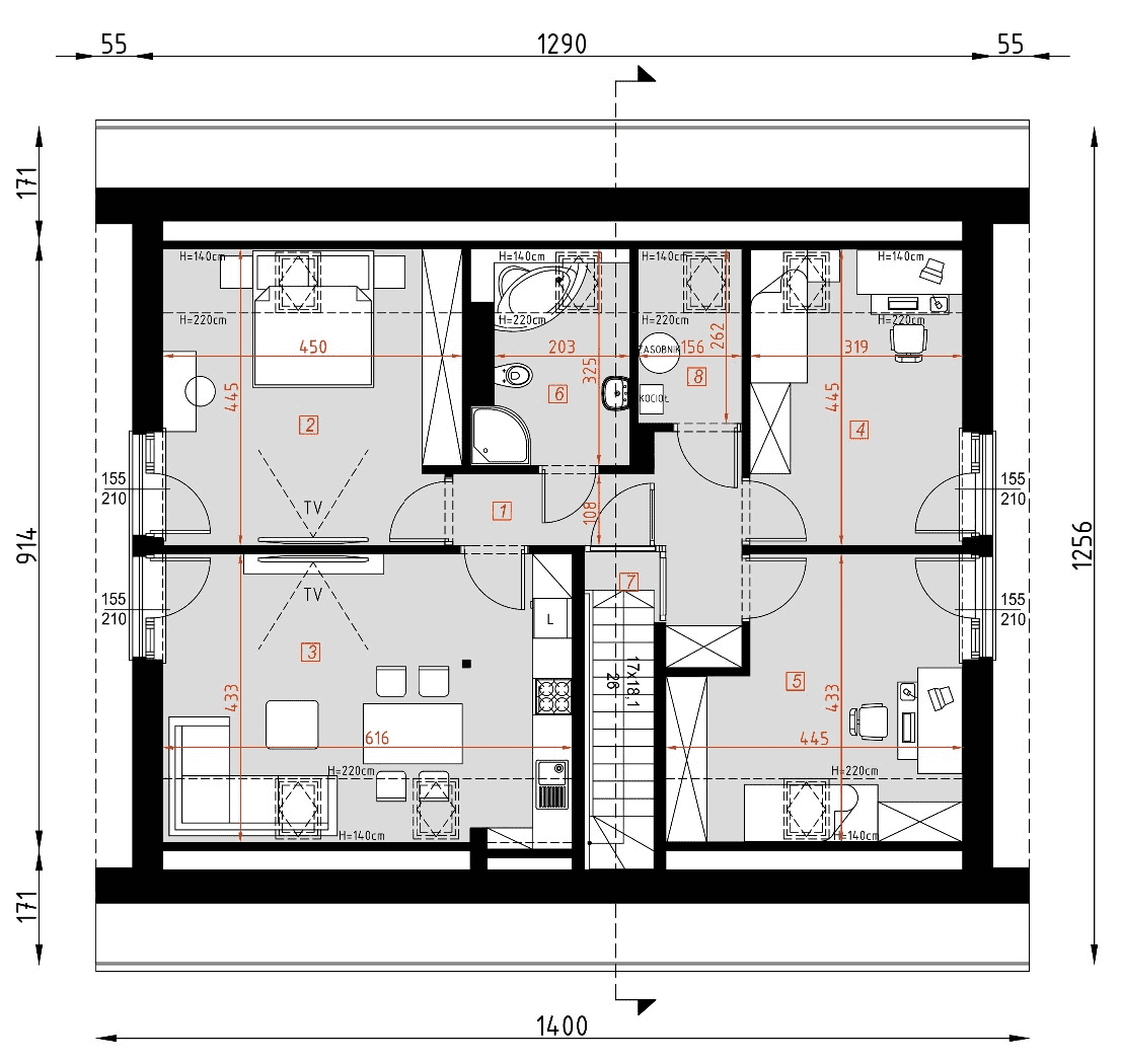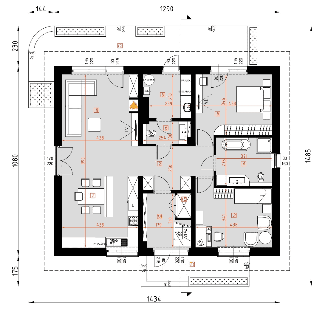 - rzuty wszystkich kondygnacji (np. parter, piwnica, piętro) – rozmieszczenie i wymiary wszystkich pomieszczeń, rozmieszczenie i wielkość otworów okiennych i drzwiowych, rozmieszczenie kominów, sugerowana aranżacja wnętrz.