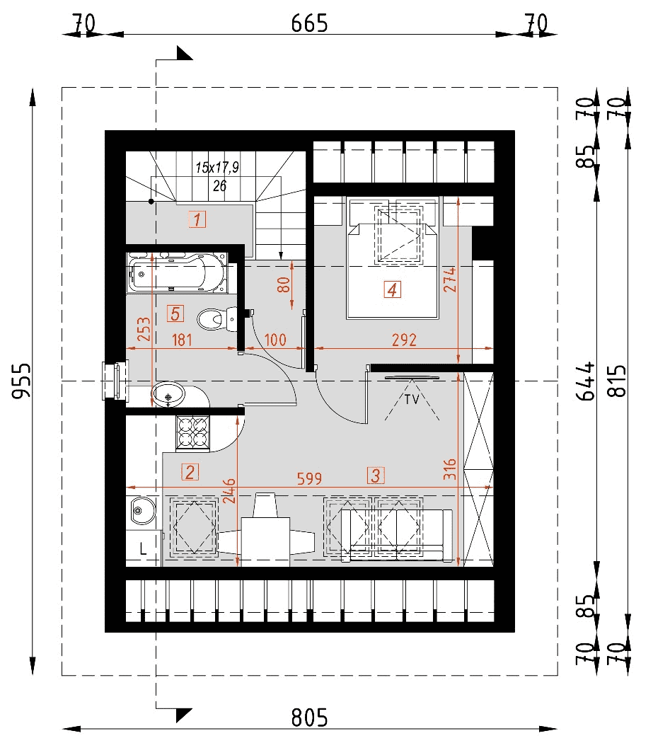 - rzuty wszystkich kondygnacji (np. parter, piwnica, piętro) – rozmieszczenie i wymiary wszystkich pomieszczeń, rozmieszczenie i wielkość otworów okiennych i drzwiowych, rozmieszczenie kominów, sugerowana aranżacja wnętrz.