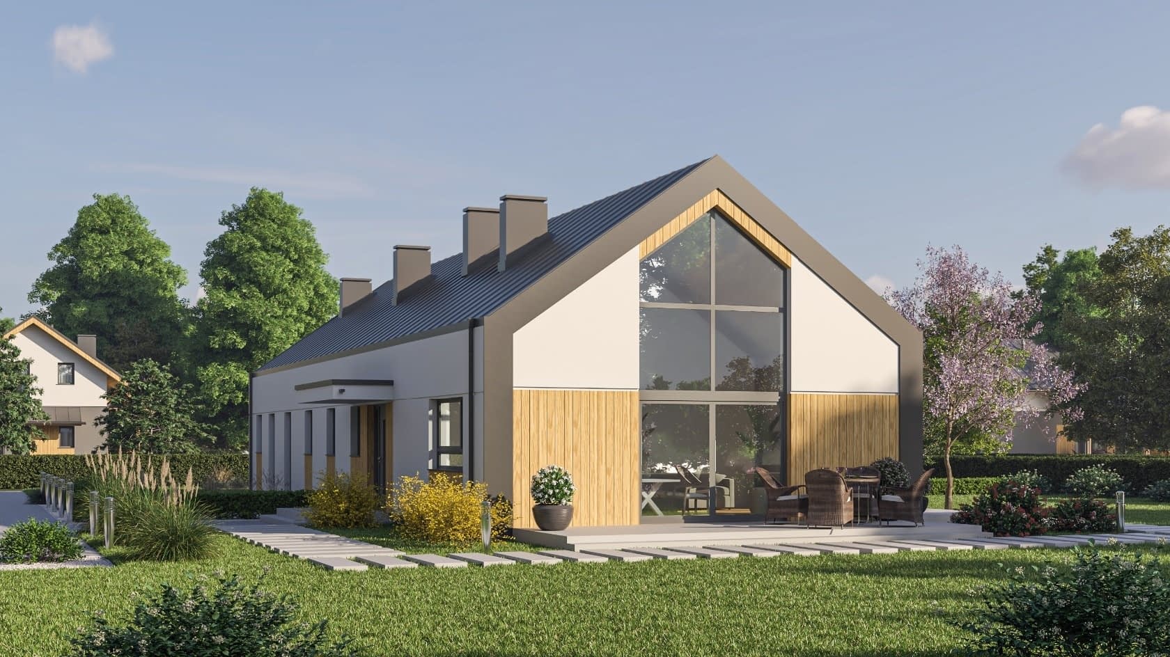 Elewacja: tynk elewacyjny mineralny, panele elewacyje imitujące drewno