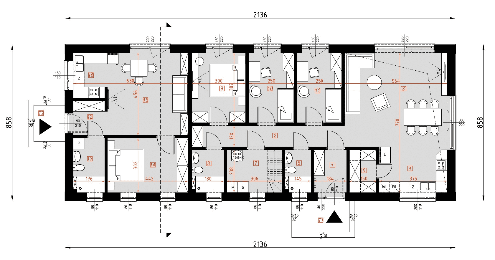 - rzuty wszystkich kondygnacji (np. parter, piwnica, piętro) – rozmieszczenie i wymiary wszystkich pomieszczeń, rozmieszczenie i wielkość otworów okiennych i drzwiowych, rozmieszczenie kominów, sugerowana aranżacja wnętrz.