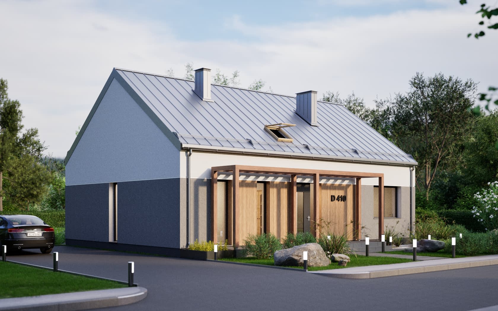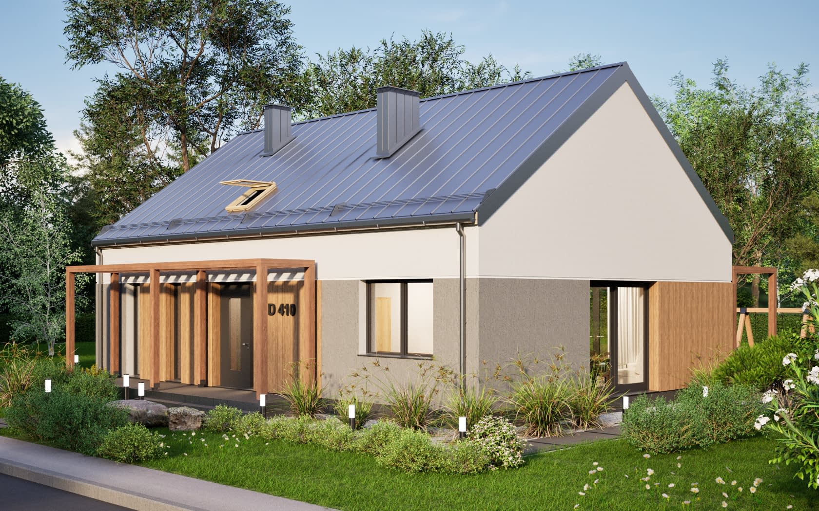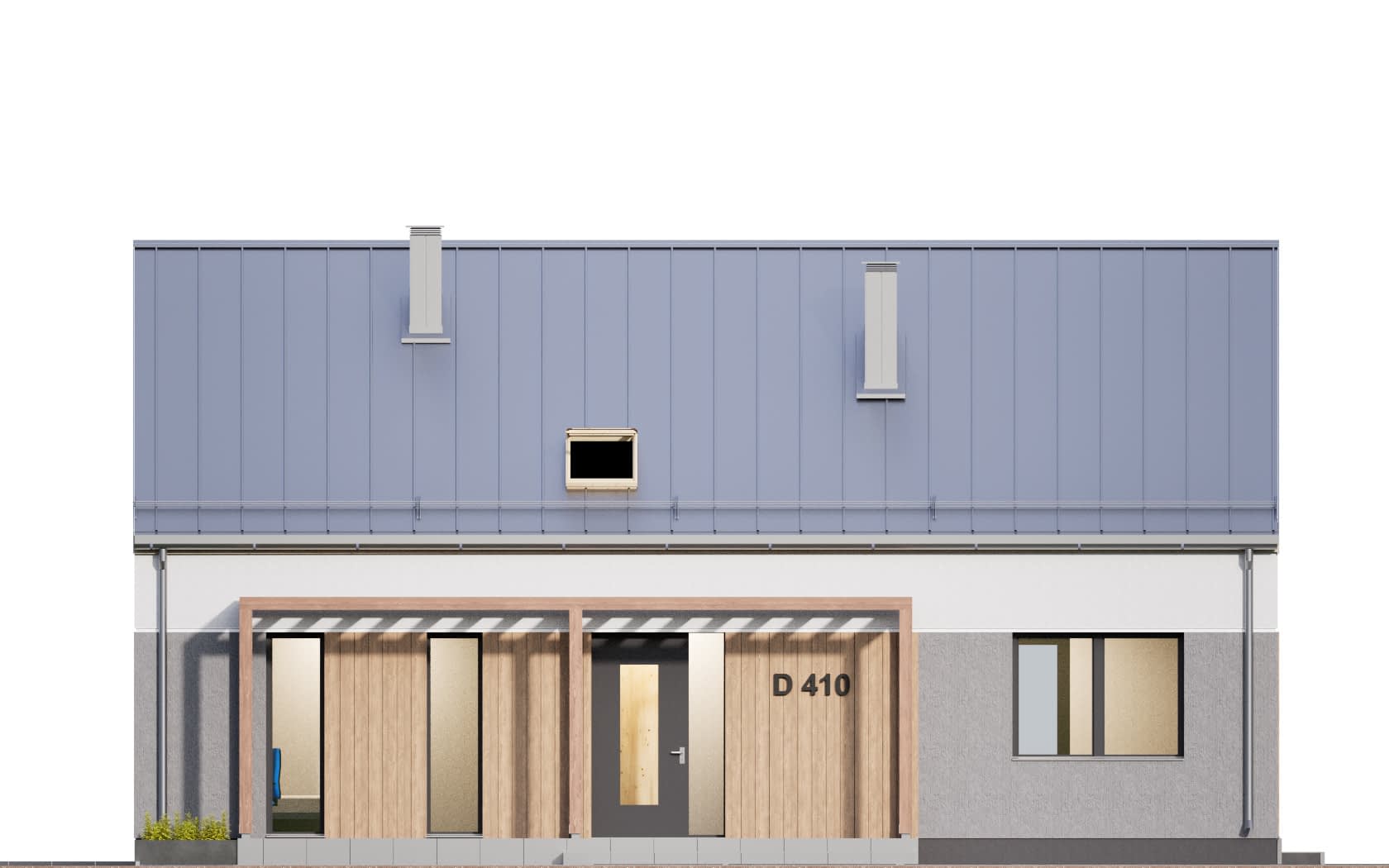 D410 to nowoczesny parterowy dom w technologii murowanej, bezokapowy, z otwarciem nad salonem i kuchnią, nad pozostałą częścią poddasze nieużytkowe.Konstrukcja