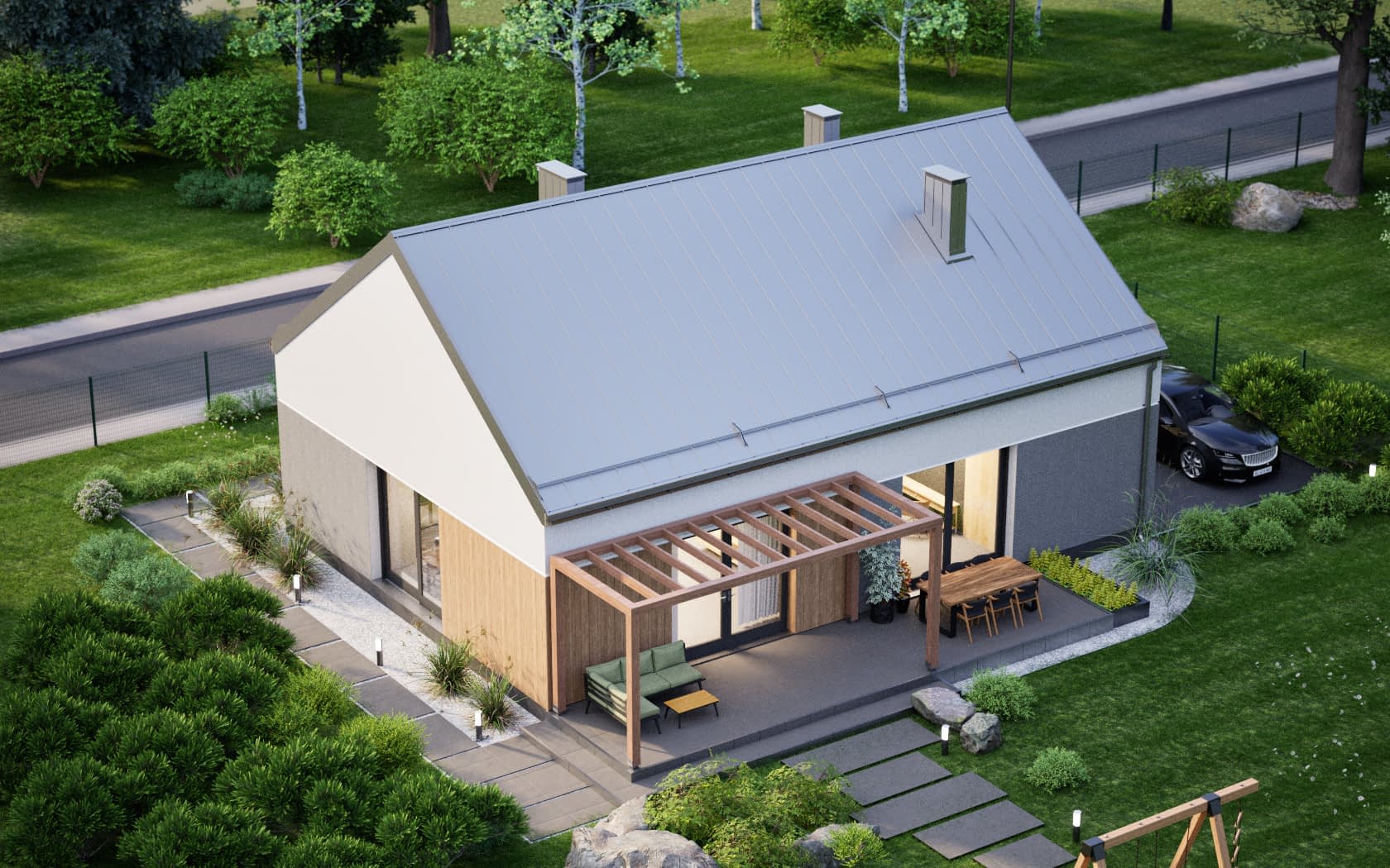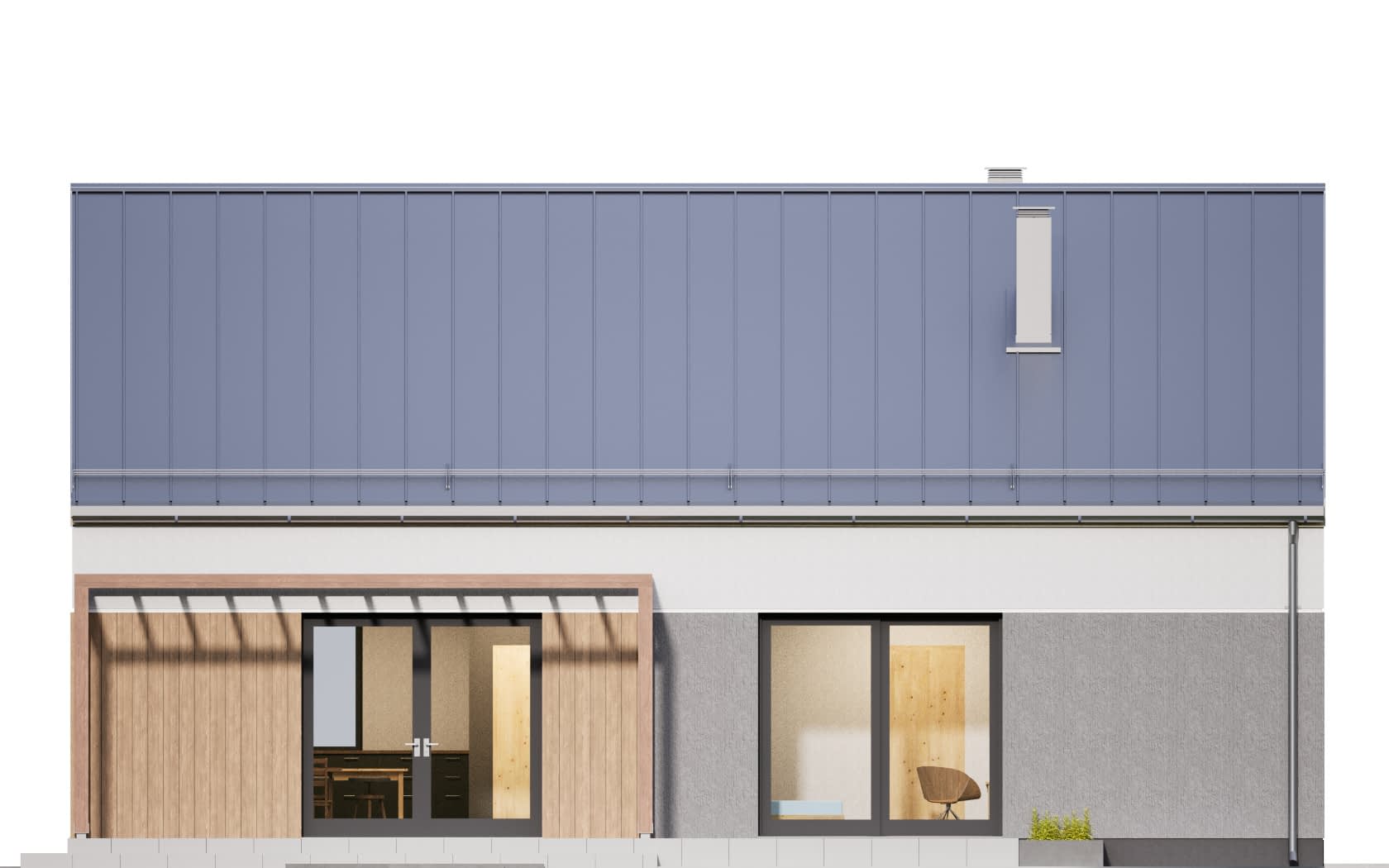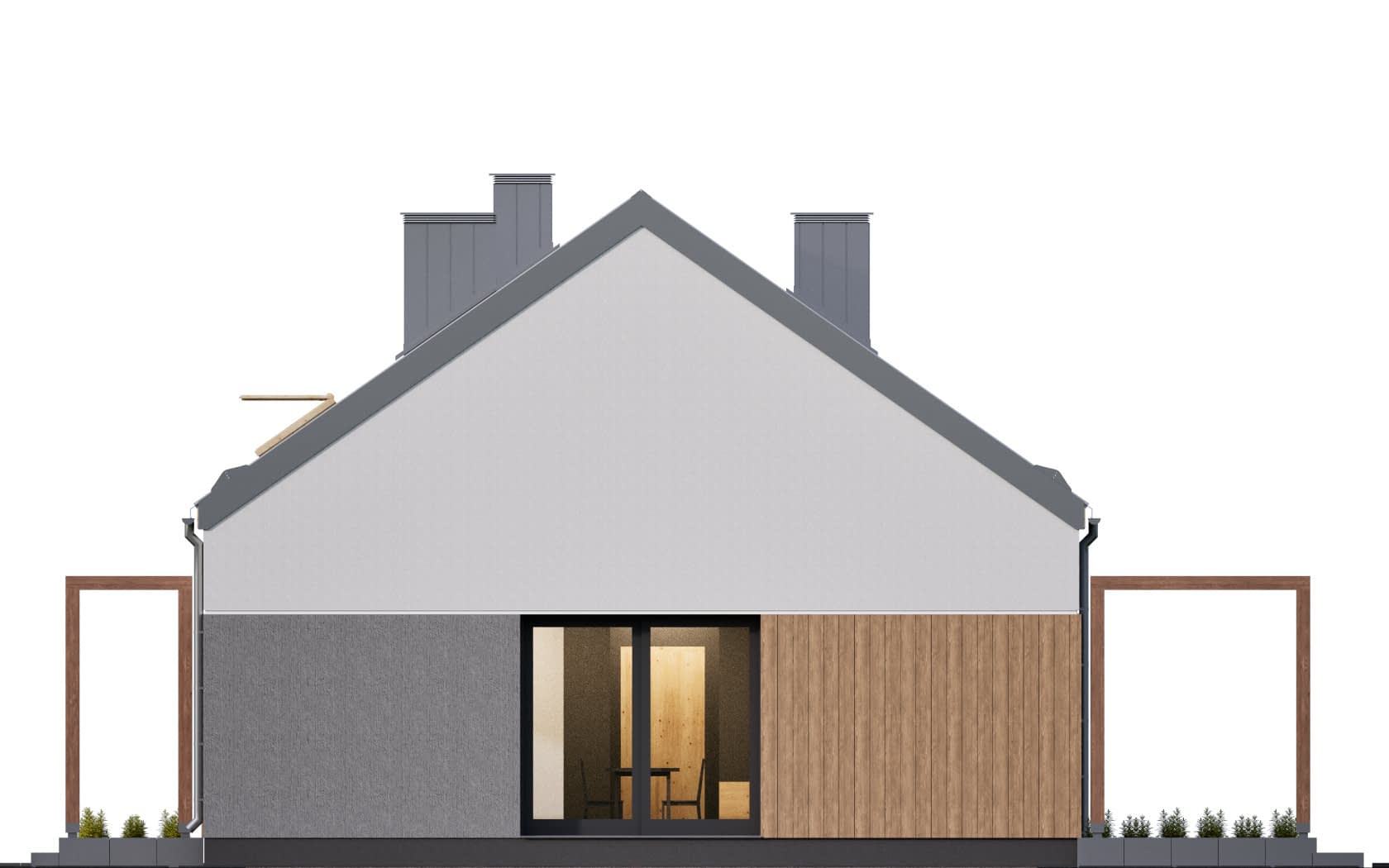 Elewacja: tynk elewacyjny cienkowarstwowy, na fragmentach deskowanie pionowe