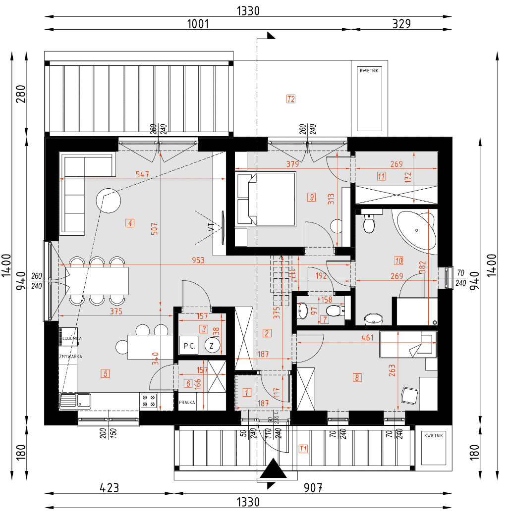 - rzuty wszystkich kondygnacji (np. parter, piwnica, piętro) – rozmieszczenie i wymiary wszystkich pomieszczeń, rozmieszczenie i wielkość otworów okiennych i drzwiowych, rozmieszczenie kominów, sugerowana aranżacja wnętrz.