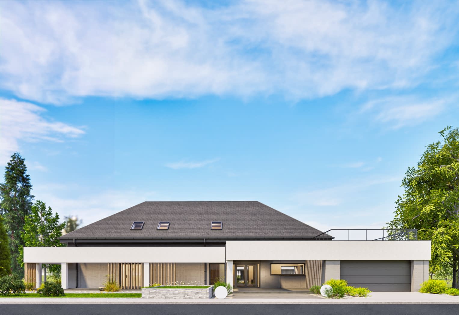 - elewacje (frontowa, dwie elewacje boczne, ogrodowa) – dokładny wygląd domu z każdej strony.