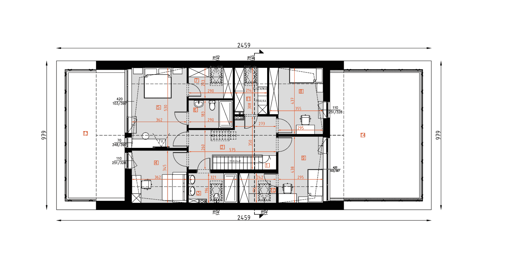 - rzuty wszystkich kondygnacji (np. parter, piwnica, piętro) – rozmieszczenie i wymiary wszystkich pomieszczeń, rozmieszczenie i wielkość otworów okiennych i drzwiowych, rozmieszczenie kominów, sugerowana aranżacja wnętrz.