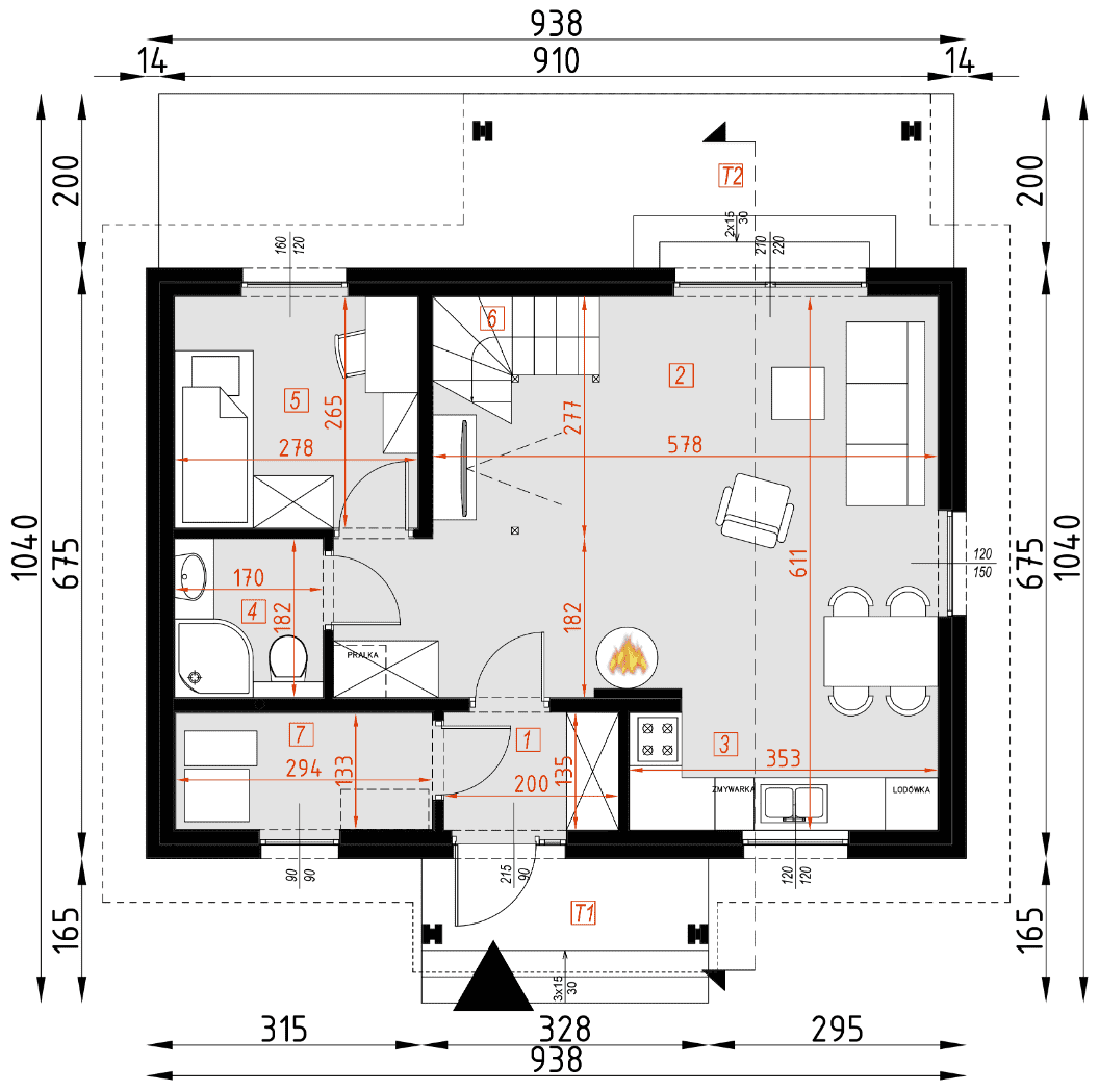 - rzuty wszystkich kondygnacji (np. parter, piwnica, piętro) – rozmieszczenie i wymiary wszystkich pomieszczeń, rozmieszczenie i wielkość otworów okiennych i drzwiowych, rozmieszczenie kominów, sugerowana aranżacja wnętrz.