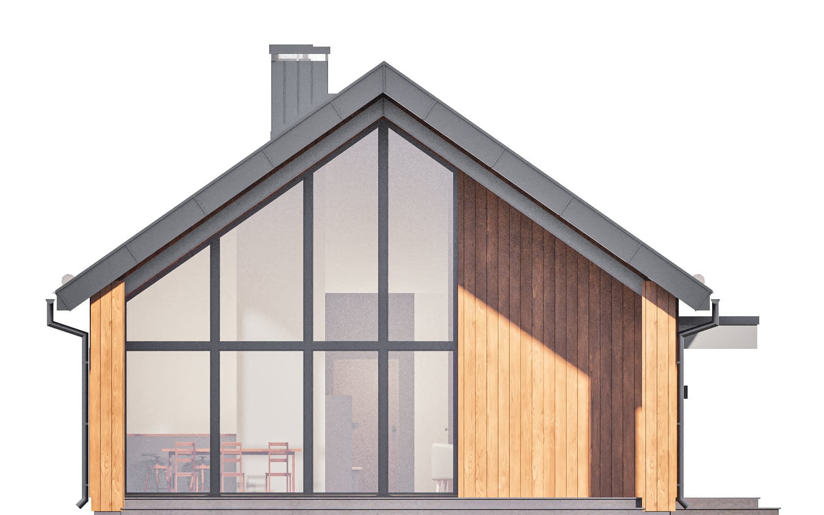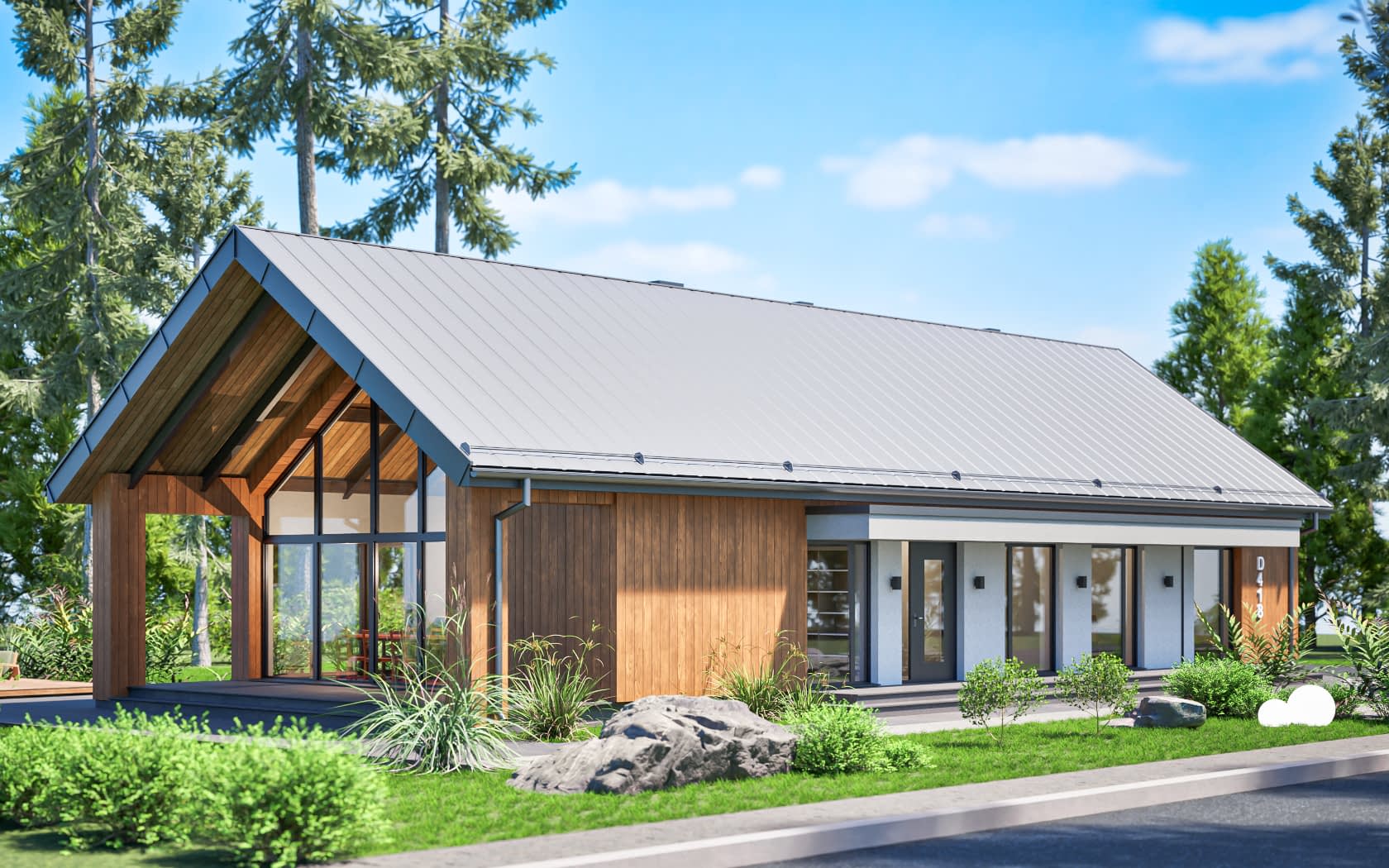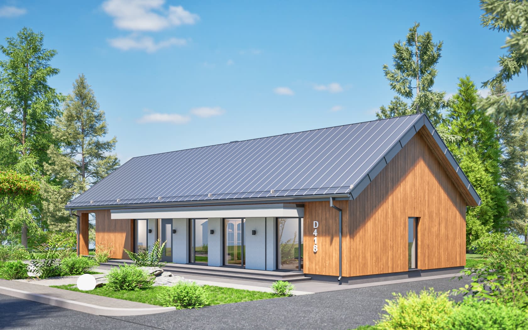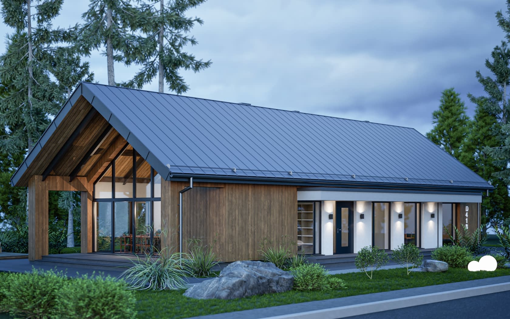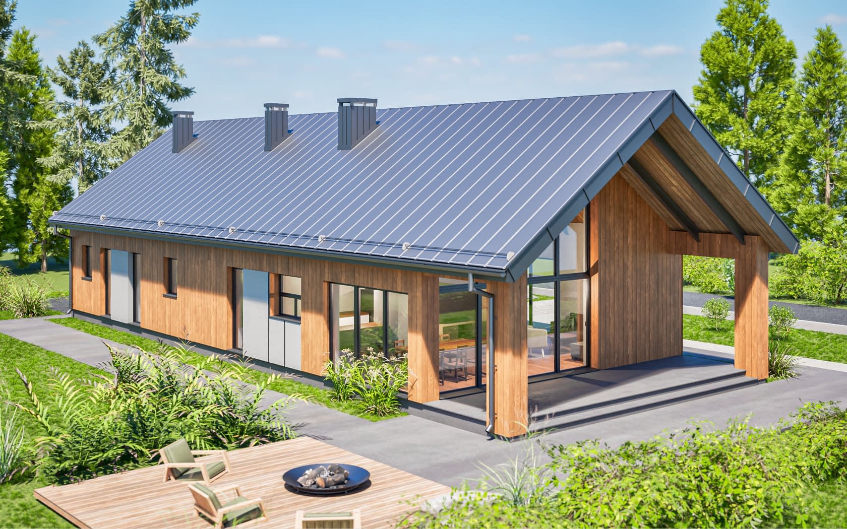 D418 dom parterowy w technologii drewnianej w typie nowoczesnej stodoły, z otwarciem nad pokojem dziennym i zadaszonym tarasem.Konstrukcja