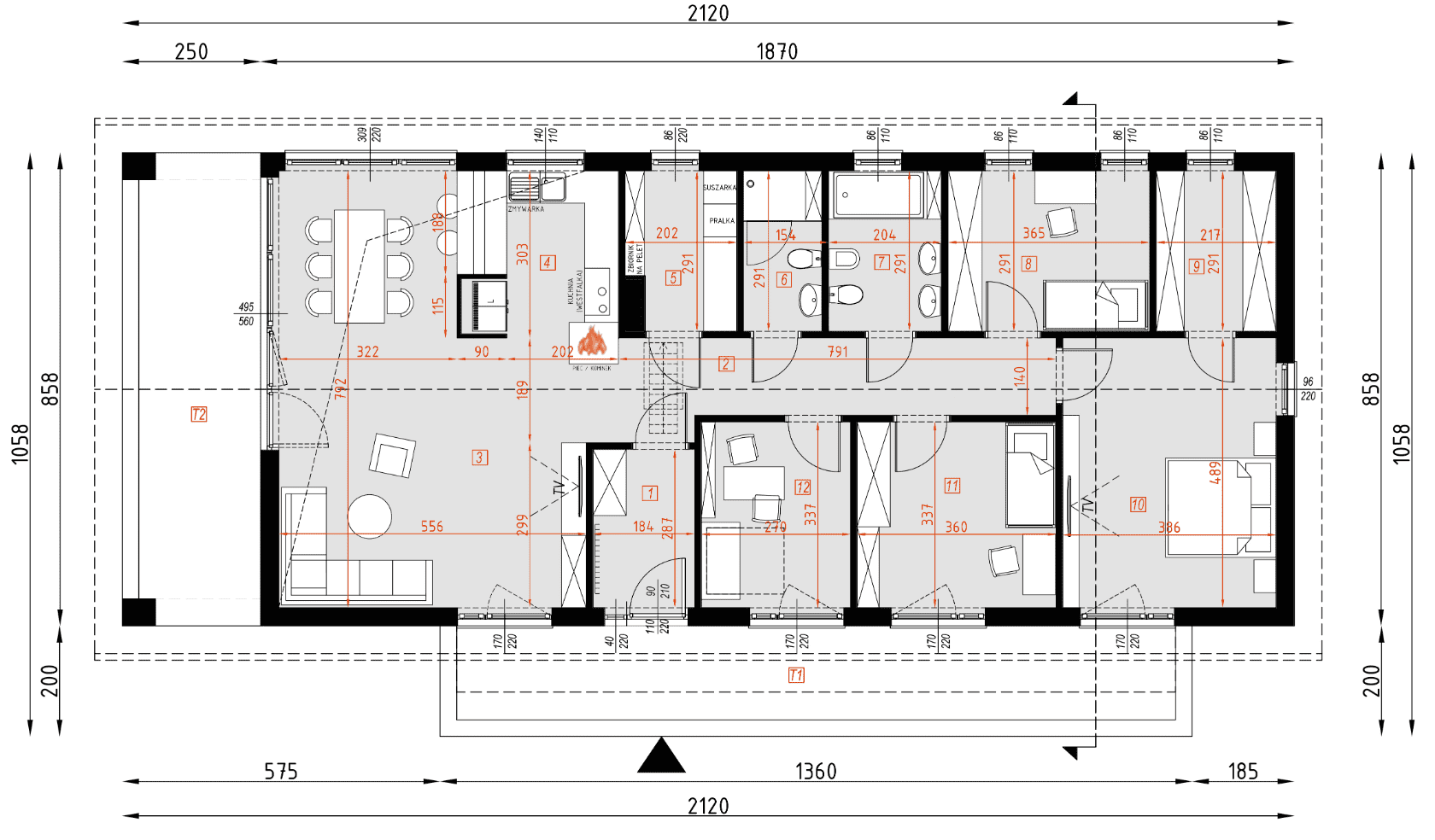- rzuty wszystkich kondygnacji (np. parter, piwnica, piętro) – rozmieszczenie i wymiary wszystkich pomieszczeń, rozmieszczenie i wielkość otworów okiennych i drzwiowych, rozmieszczenie kominów, sugerowana aranżacja wnętrz.