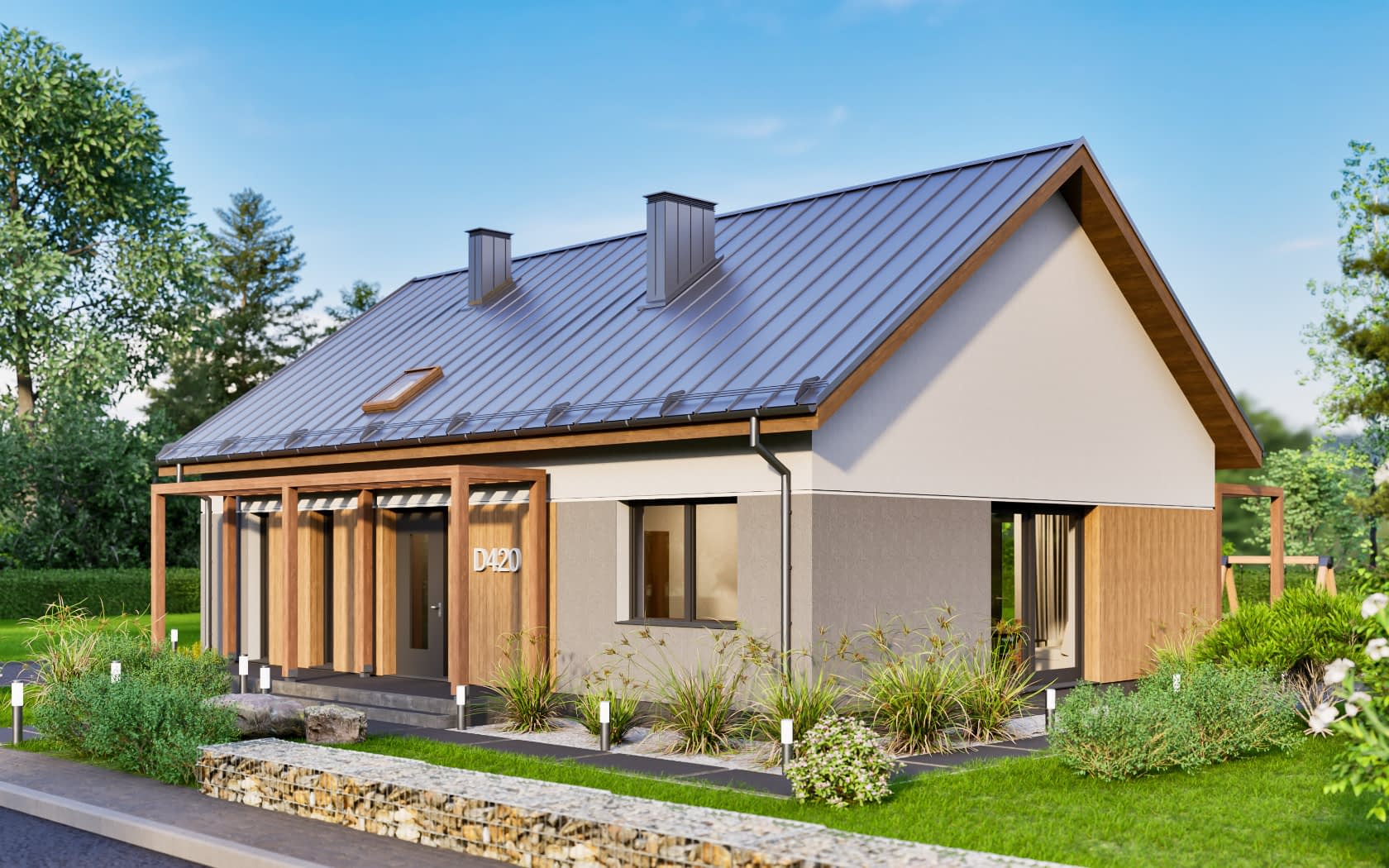 D420 to nowoczesny parterowy dom w technologii murowanej, z otwarciem nad salonem i kuchnią, nad pozostałą częścią poddasze nieużytkowe.Konstrukcja