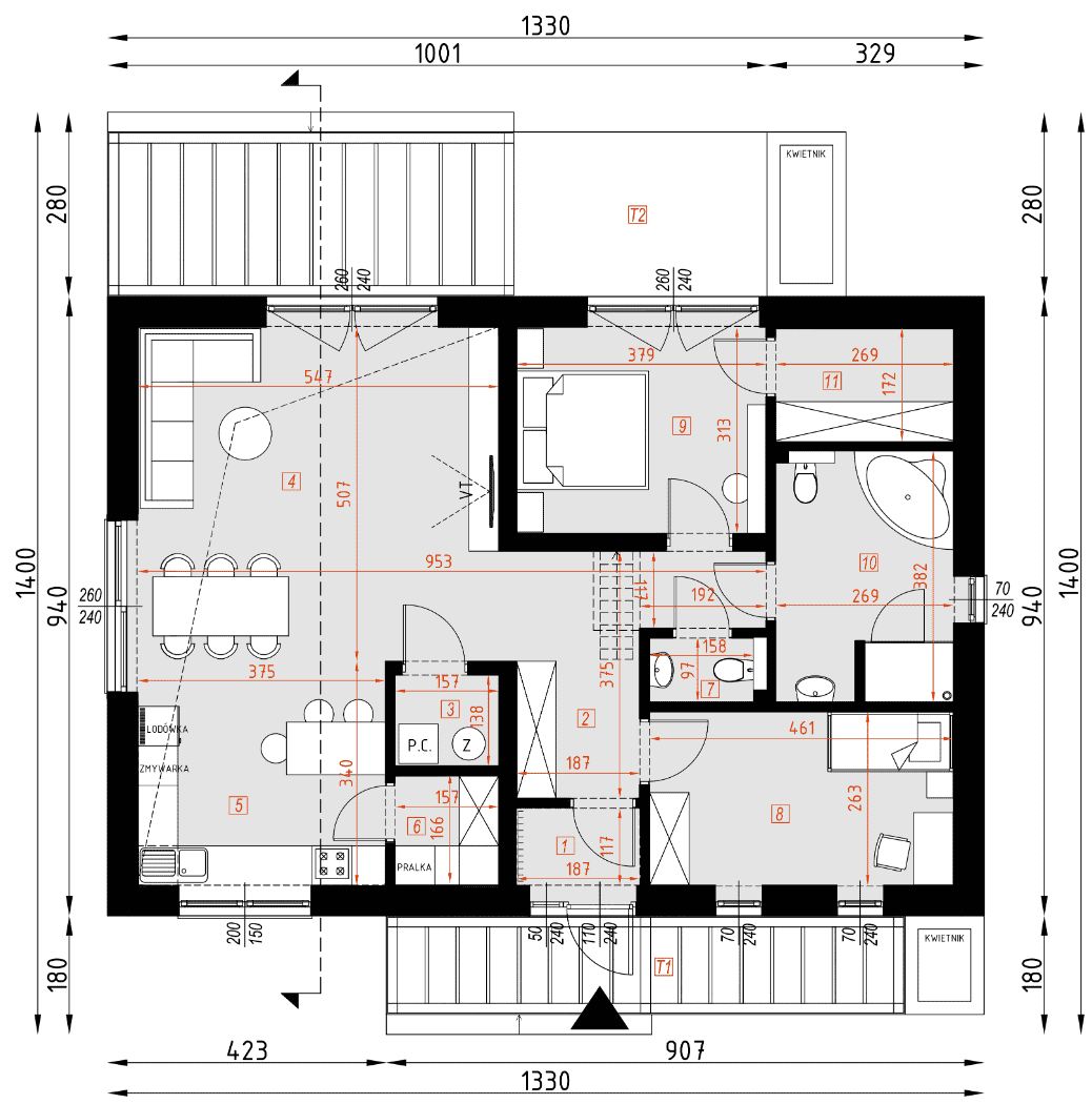 - rzuty wszystkich kondygnacji (np. parter, piwnica, piętro) – rozmieszczenie i wymiary wszystkich pomieszczeń, rozmieszczenie i wielkość otworów okiennych i drzwiowych, rozmieszczenie kominów, sugerowana aranżacja wnętrz.