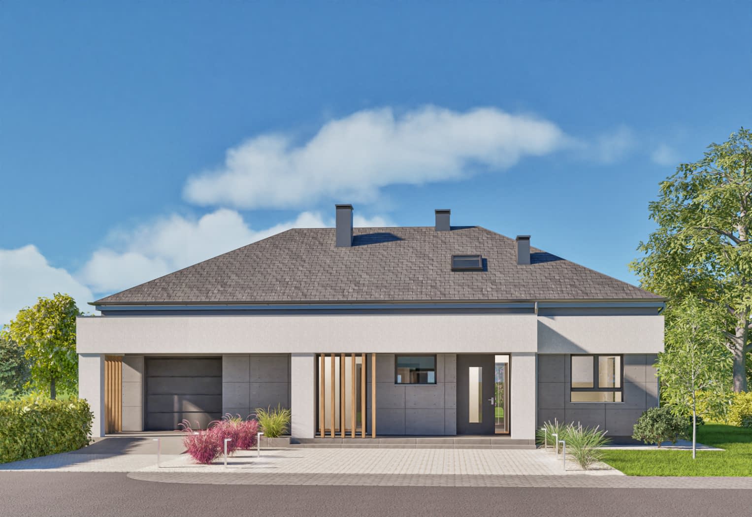 - elewacje (frontowa, dwie elewacje boczne, ogrodowa) – dokładny wygląd domu z każdej strony.