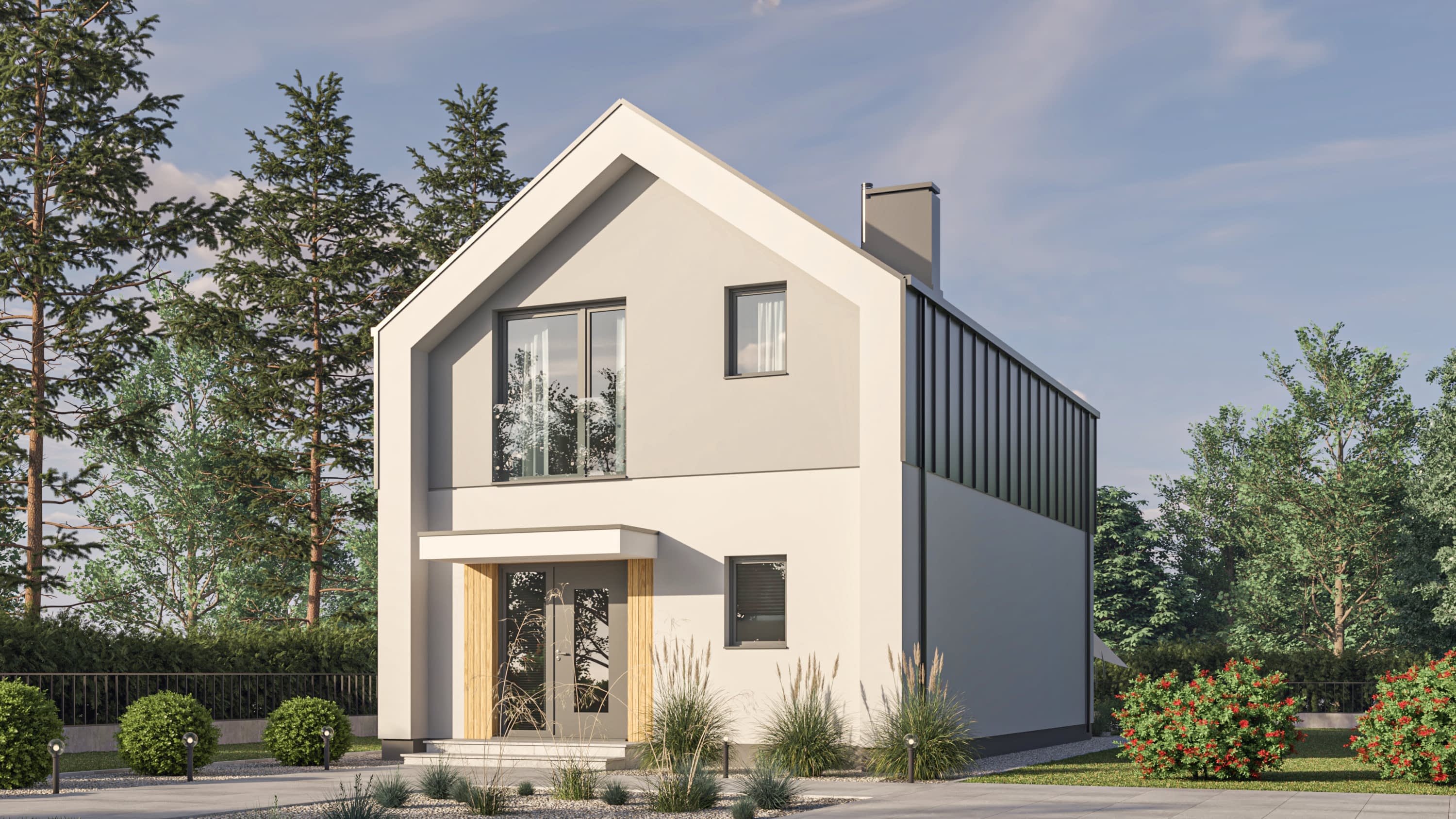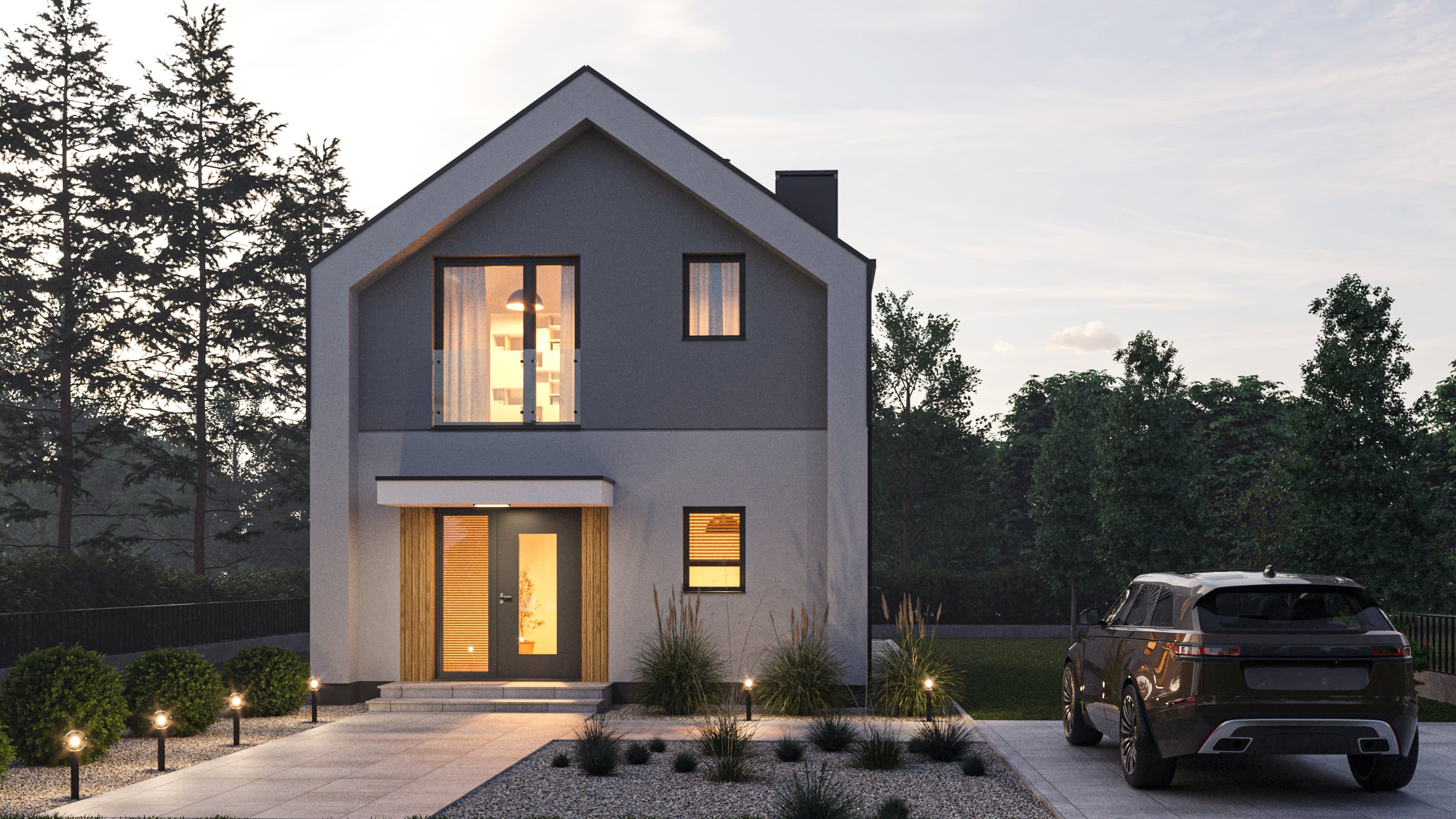 - elewacje (frontowa, dwie elewacje boczne, ogrodowa) – dokładny wygląd domu z każdej strony.