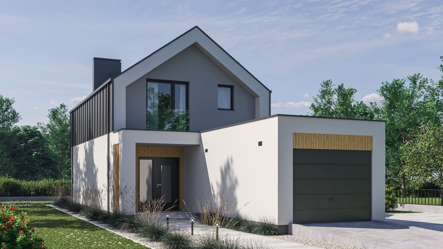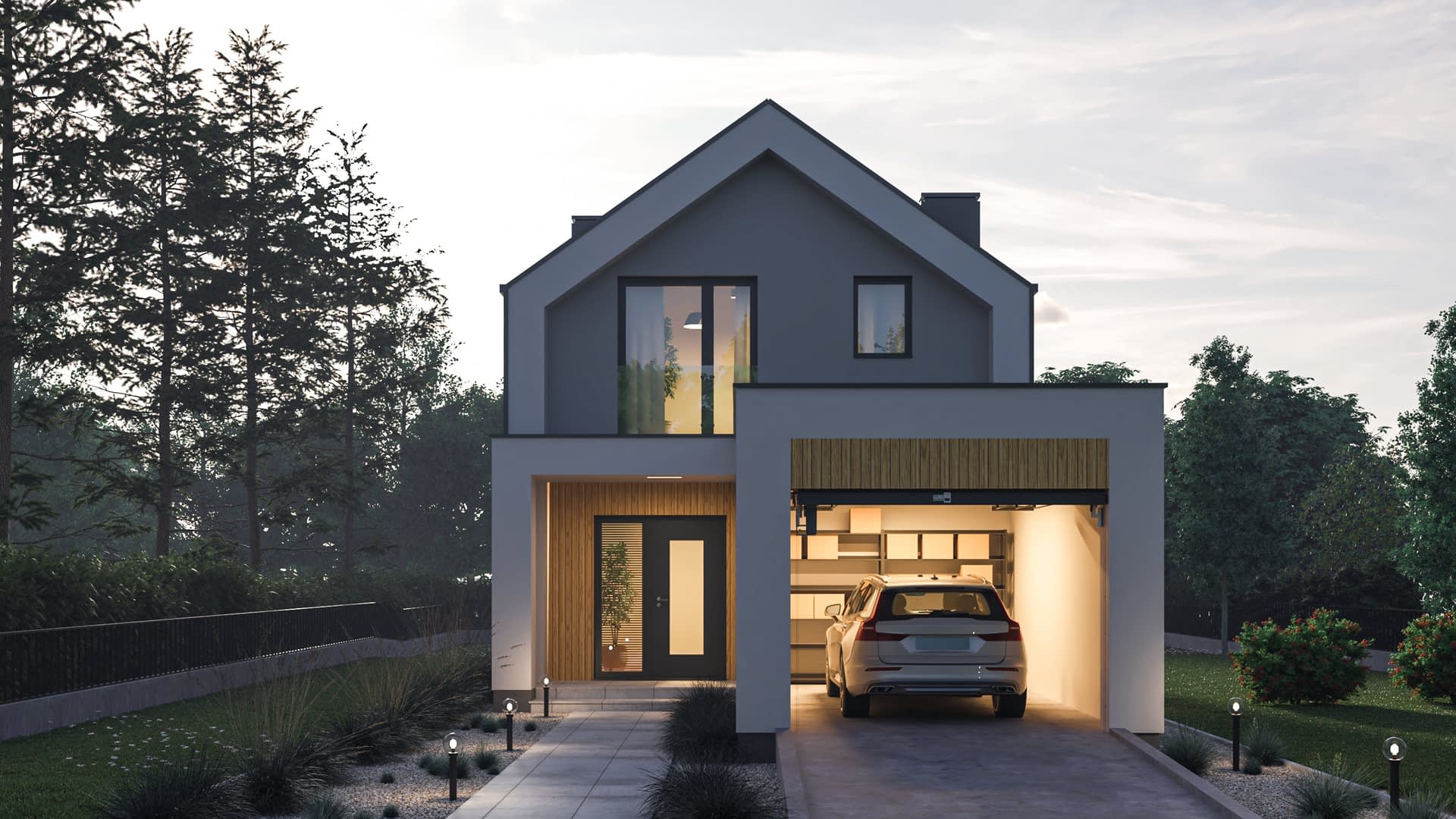 - elewacje (frontowa, dwie elewacje boczne, ogrodowa) – dokładny wygląd domu z każdej strony.