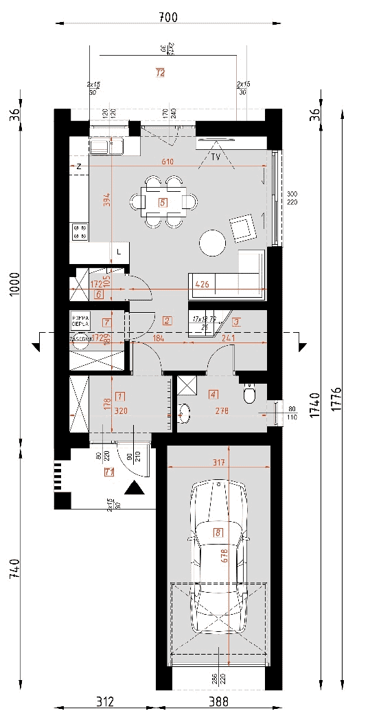 - rzuty wszystkich kondygnacji (np. parter, piwnica, piętro) – rozmieszczenie i wymiary wszystkich pomieszczeń, rozmieszczenie i wielkość otworów okiennych i drzwiowych, rozmieszczenie kominów, sugerowana aranżacja wnętrz.