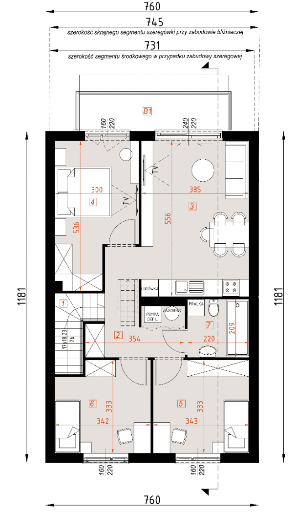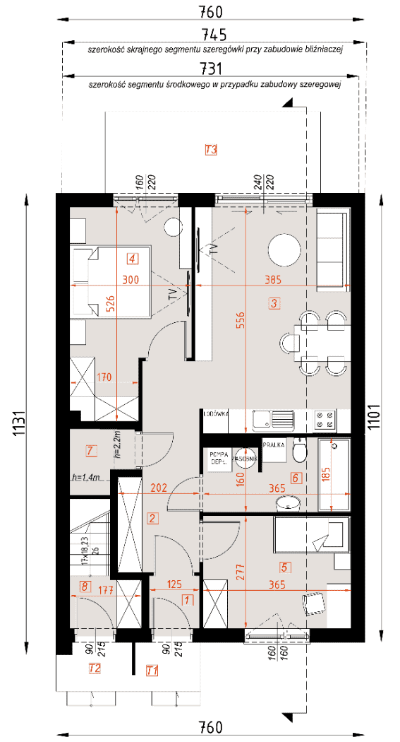 Dom jednorodzinny, dwulokalowy, z piętrem w technologii murowanej. Możliwość zbliźniaczenia lub postawienia w zabudowie szeregowej. Podany koszt, to koszt jednego segmentu.Konstrukcja