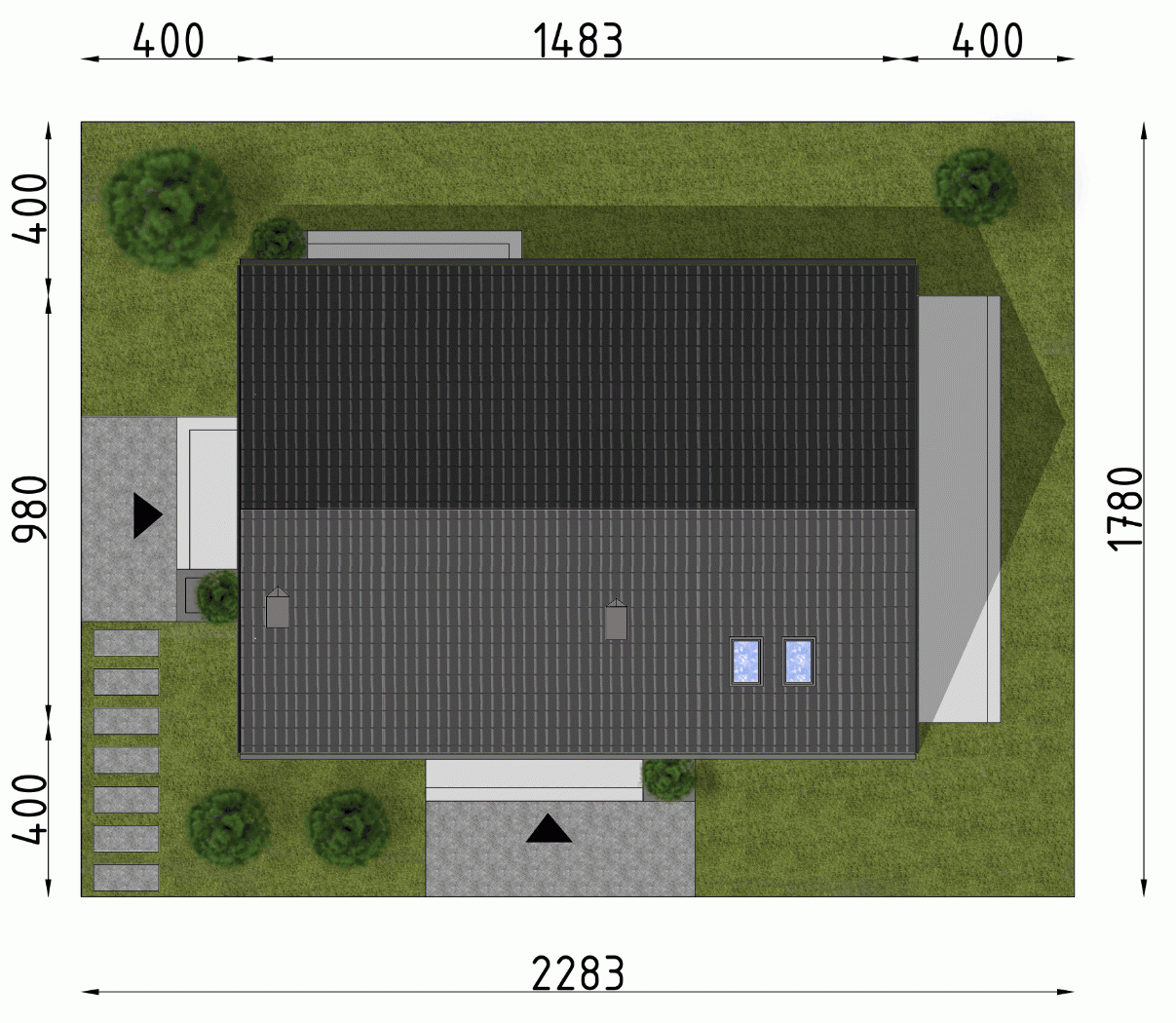 - elewacje (frontowa, dwie elewacje boczne, ogrodowa) – dokładny wygląd domu z każdej strony.