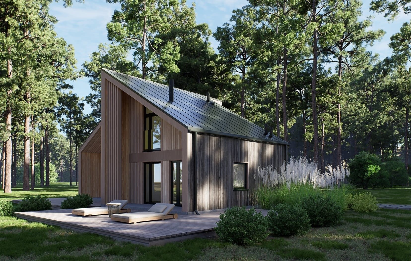 D434A niewielki wygodny domek letniskowy parterowy z antresolą w szkielecie drewnianym w zabudowie bliźniaczej.Konstrukcja
