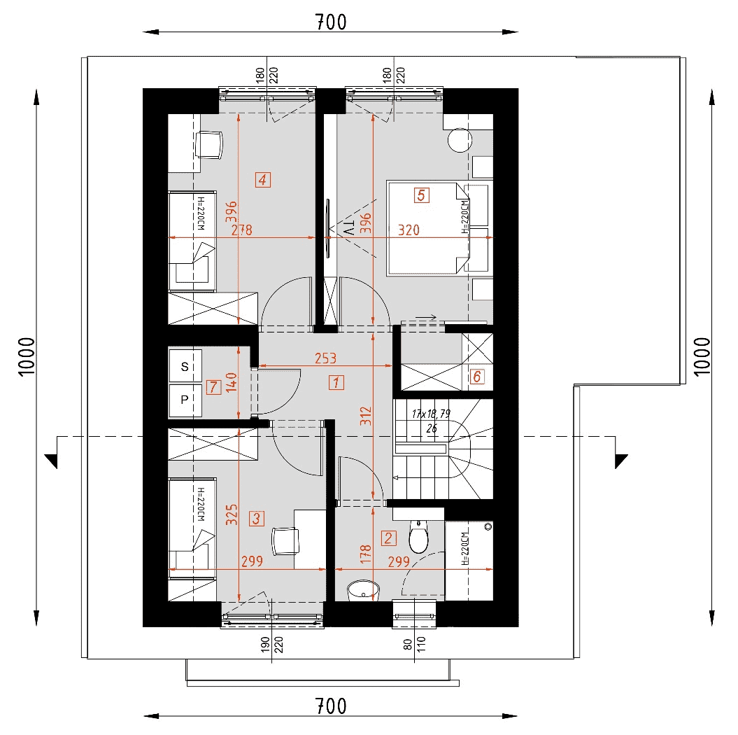 - rzuty wszystkich kondygnacji (np. parter, piwnica, piętro) – rozmieszczenie i wymiary wszystkich pomieszczeń, rozmieszczenie i wielkość otworów okiennych i drzwiowych, rozmieszczenie kominów, sugerowana aranżacja wnętrz.