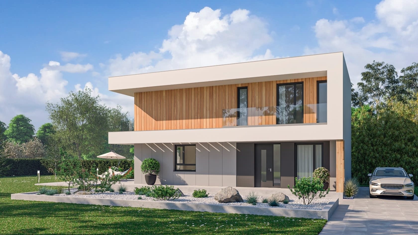 Elewacja: tynk cienkowarstwowy, drewno elewacyjne, płyty elewacyjne.